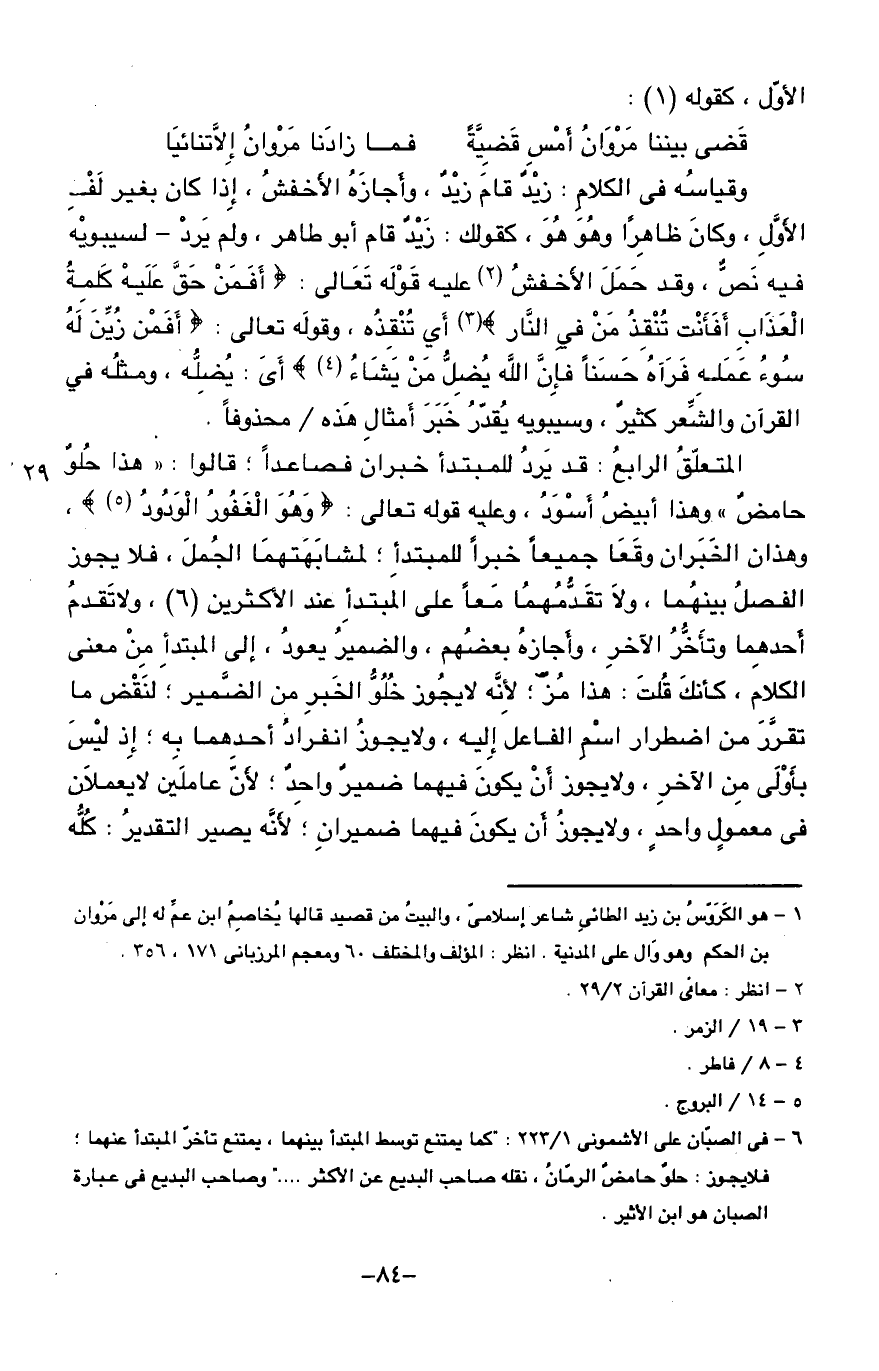 (¬6) - فى الصبّان على الأشمونى 1/ 223:" كما يمتنع توسط المبتدأ بينهما، يمتنع تأخرّ المبتدأ عنهما؛ فلا يجوز: حلو حامض الرمّان، نقله صاحب البديع عن الأكثر ... " وصاحب البديع فى عبارة الصبان هو ابن الأثير.
