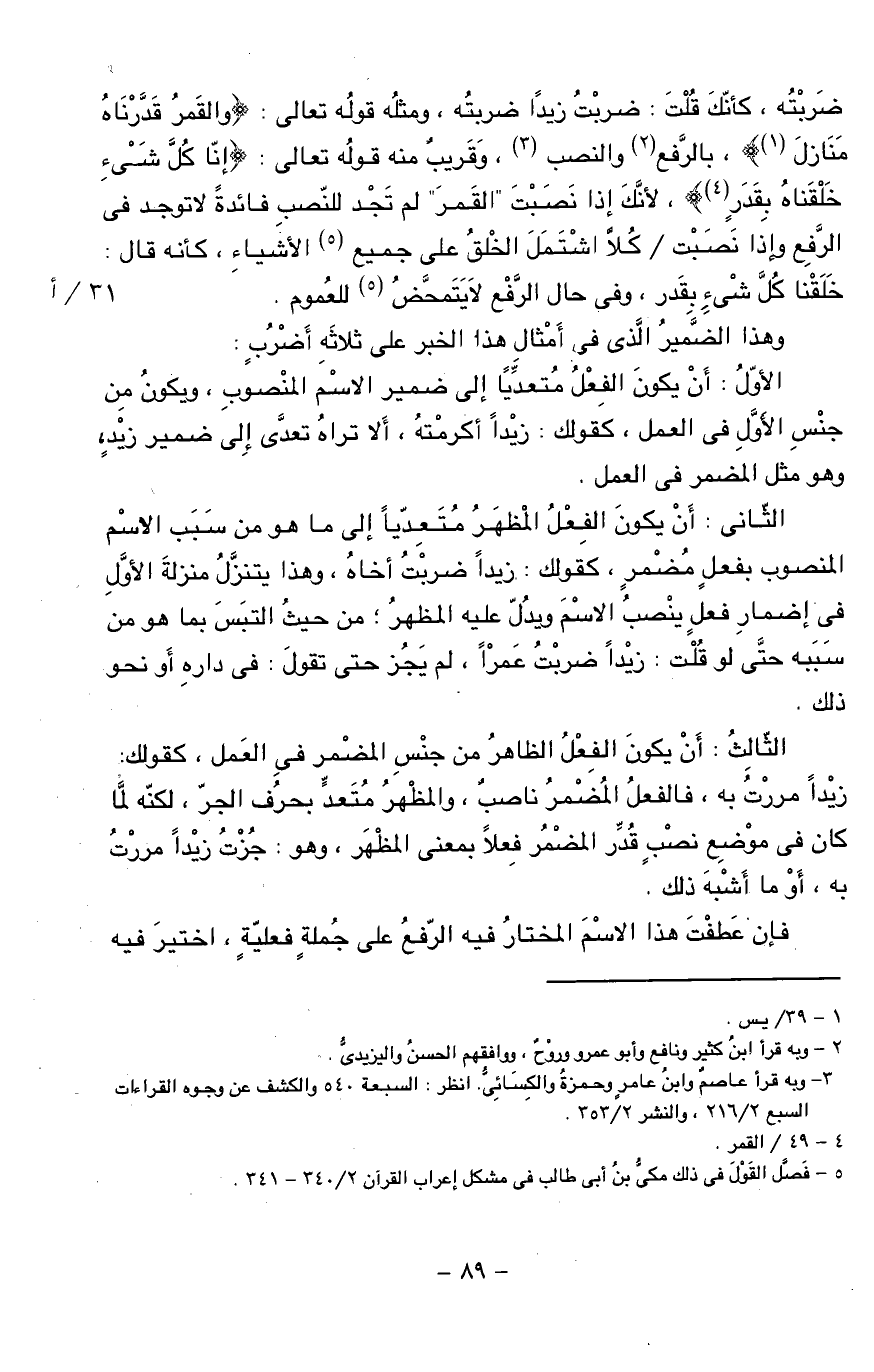 ضربته، كأنّك قلت: ضربت زيدا ضربته، ومثله قوله تعالى: وَالْقَمَرَ قَدَّرْناهُ مَنازِلَ (¬1)، بالرّفع (¬2) والنصب (¬3)، وقريب منه قوله تعالى: إِنَّا كُلَّ شَيْءٍ خَلَقْناهُ بِقَدَرٍ (¬4)، لأنّك إذا نصبت" القمر" لم تجد للنّصب فائدة لا توجد فى الرّفع وإذا نصبت/ كلا اشتمل الخلق على جميع (¬5) الأشياء، كأنه قال: