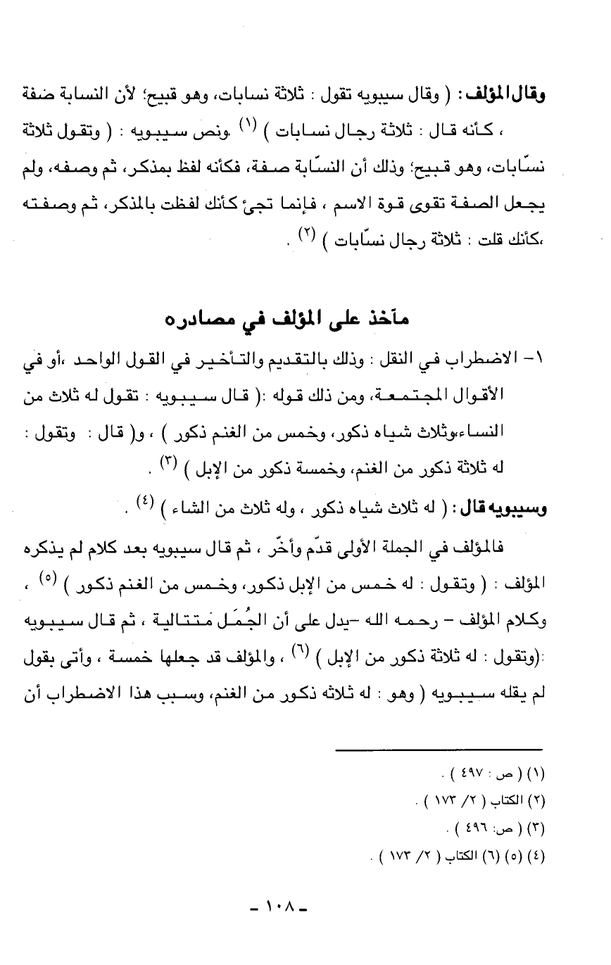 فالمؤلف في الجملة الأولى قدّم وأخّر، ثم قال سيبويه بعد كلام لم يذكره المؤلف: (وتقول: له خمس من الإبل ذكور، وخمس من الغنم ذكور) (¬5)، وكلام المؤلف - رحمه الله - يدل على أن الجمل متتالية، ثم قال سيبويه: (وتقول: له ثلاثة ذكور من الإبل) (¬6)، والمؤلف قد جعلها خمسة، وأتى بقول لم يقله سيبويه (وهو: له ثلاثة ذكور من الغنم، وسبب هذا الاضطراب أن