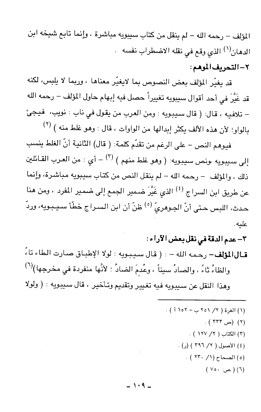 فيوهم النص - على الرغم من تقدّم كلمة: (قال) الثانية أنّ الغلط ينسب إلى سيبويه، ونص سيبويه: (وهو غلط منهم) (¬3) - أي: من العرب القائلين ذلك، والمؤلف - رحمه الله - لم ينقل النص من كتاب سيبويه مباشرة، وإنما عن طريق ابن السراج (¬4) الذي غيّر ضمير الجمع إلى ضمير المفرد، ومن هنا حدث، اللبس حتى أنّ الجوهريّ (¬5) ظنّ أن ابن السراج خطّأ سيبويه، وردّ عليه.