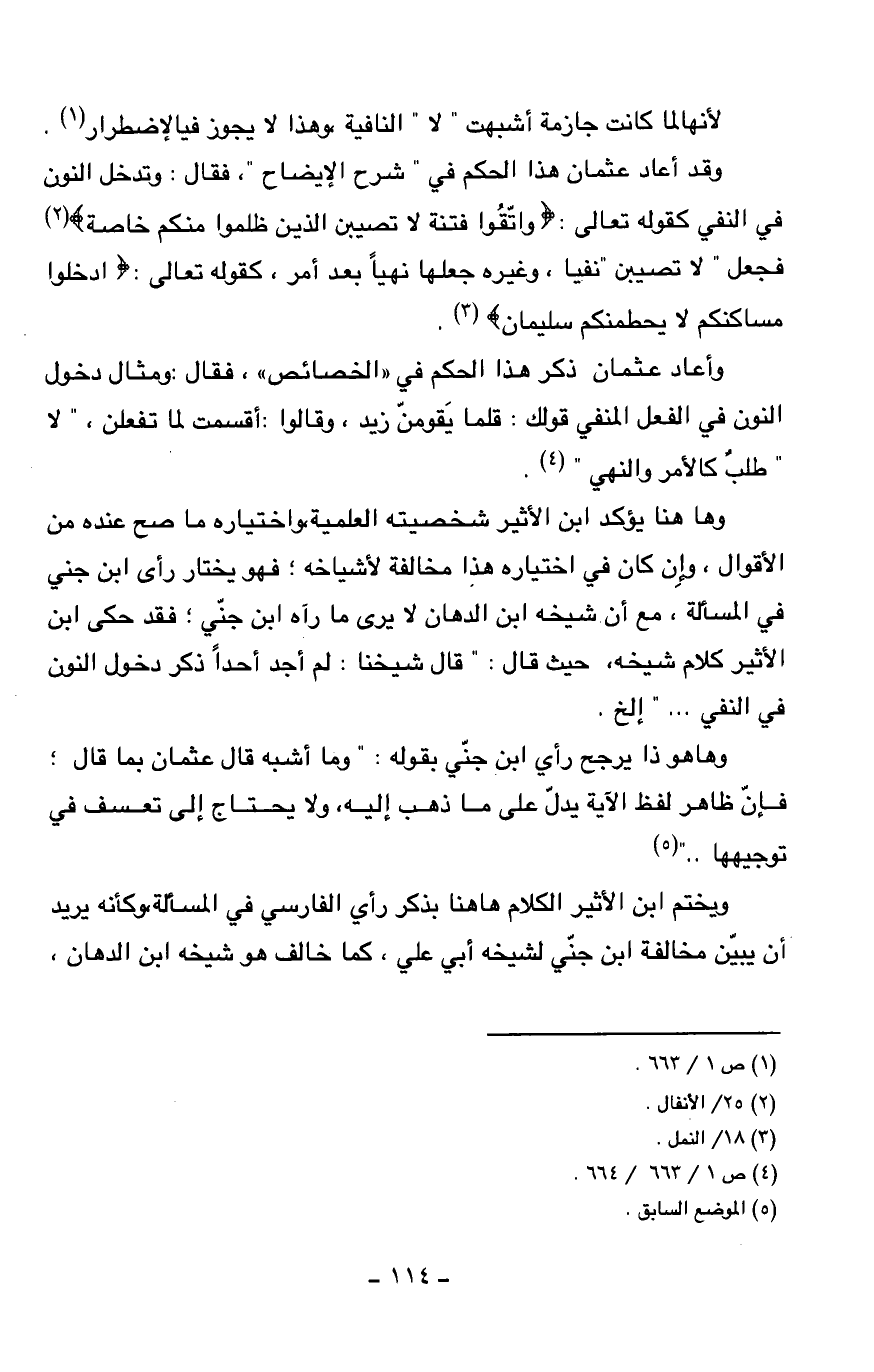 وقد أعاد عثمان هذا الحكم في" شرح الإيضاح"، فقال: وتدخل النون في النفي كقوله تعالى: وَاتَّقُوا فِتْنَةً لا تُصِيبَنَّ الَّذِينَ ظَلَمُوا مِنْكُمْ خَاصَّةً (¬2) فجعل" لا تصيبن" نفيا، وغيره جعلها نهيا بعد أمر، كقوله تعالى: ادْخُلُوا مَساكِنَكُمْ لا يَحْطِمَنَّكُمْ سُلَيْمانُ (¬3).