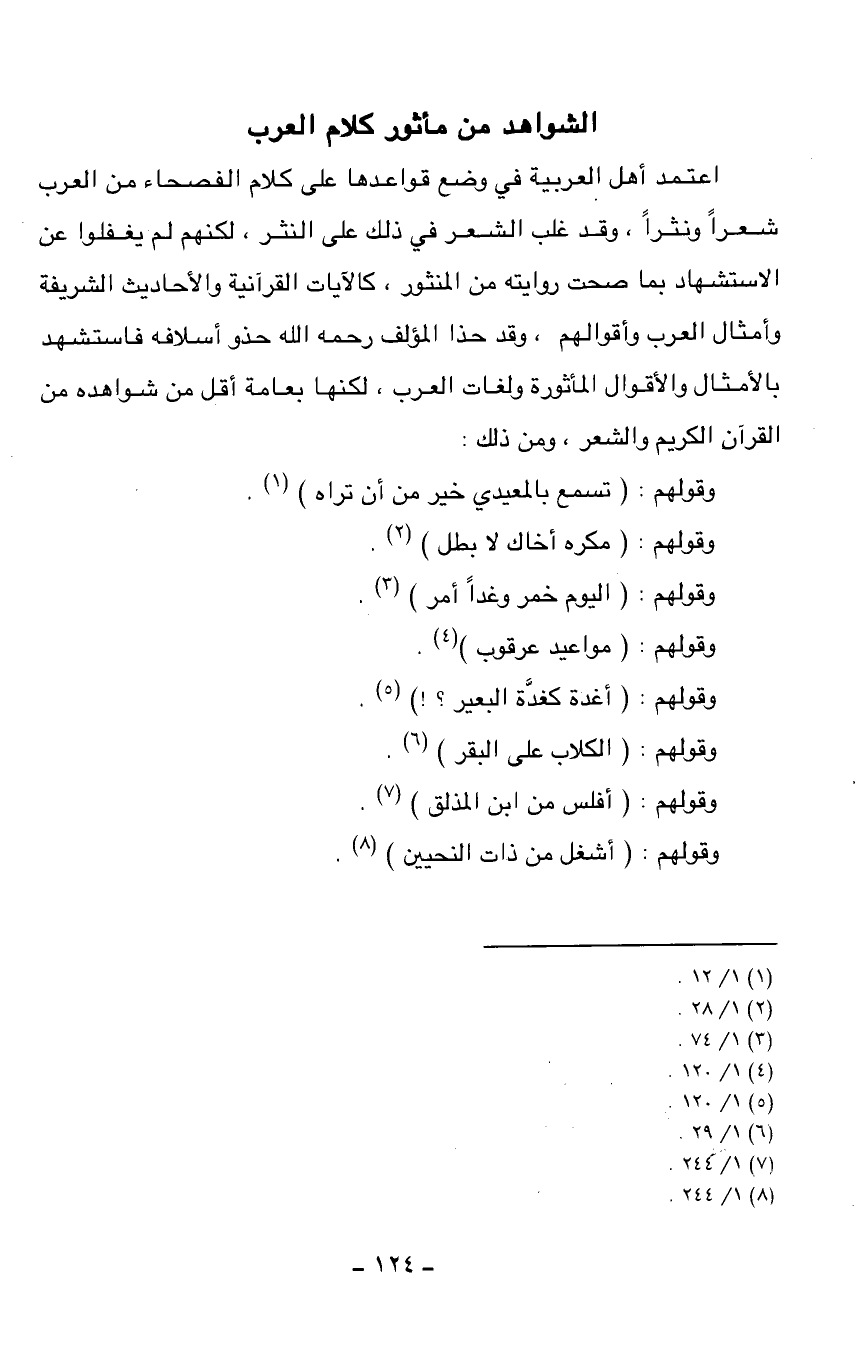 النثر، لكنهم لم يغفلوا عن الاستشهاد بما صحت روايته من المنثور، كالآيات القرآنية والأحاديث الشريفة وأمثال العرب وأقوالهم، وقد حذا المؤلف رحمه الله حذو أسلافه فاستشهد بالأمثال والأقوال المأثورة ولغات العرب، لكنها بعامة أقل من شواهده من القرآن الكريم والشعر، ومن ذلك: