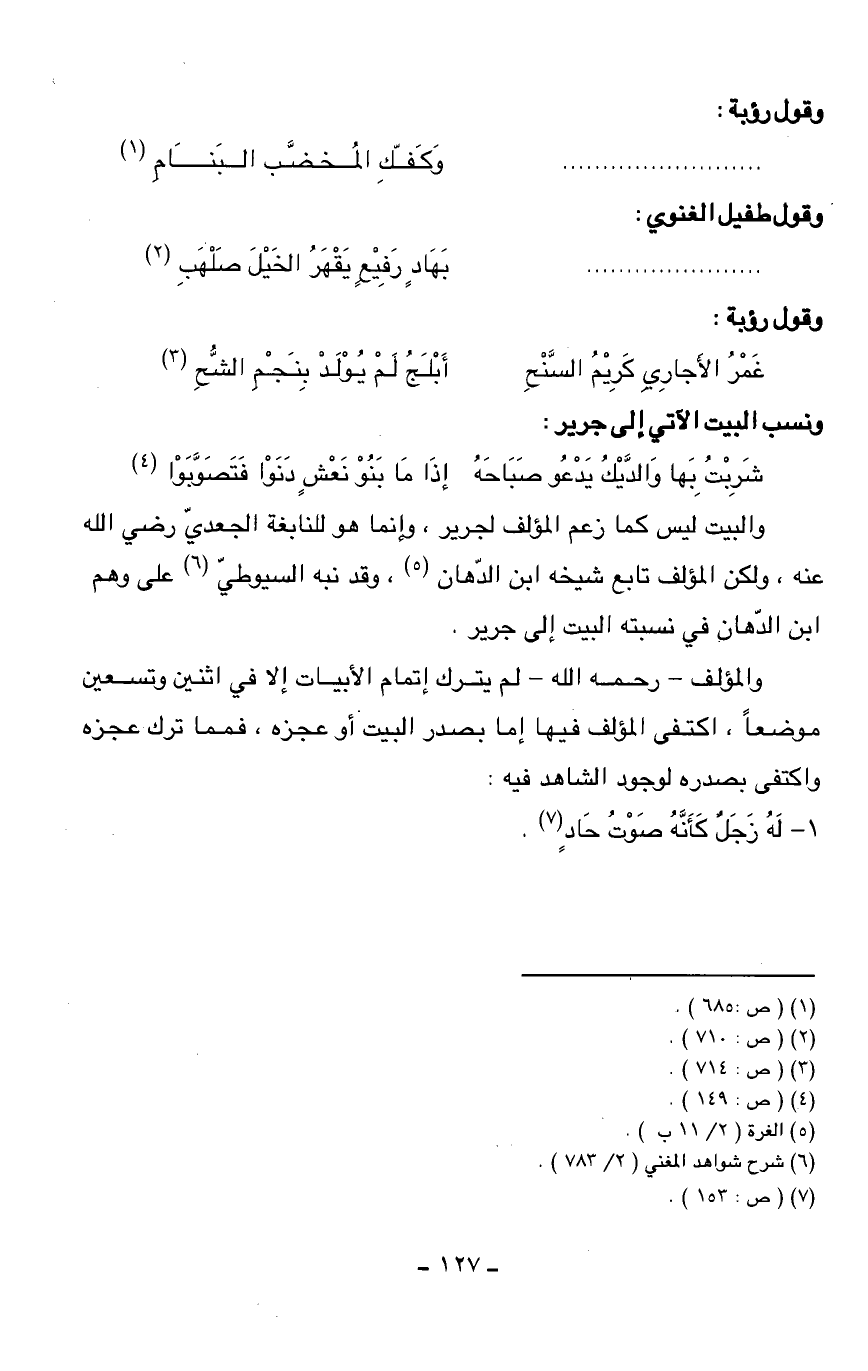 والمؤلف - رحمه الله - لم يترك إتمام الأبيات إلا في اثنين وتسعين موضعا، اكتفى المؤلف فيها إما بصدر البيت أو عجزه، فمما ترك عجزه واكتفى بصدره لوجود الشاهد فيه: