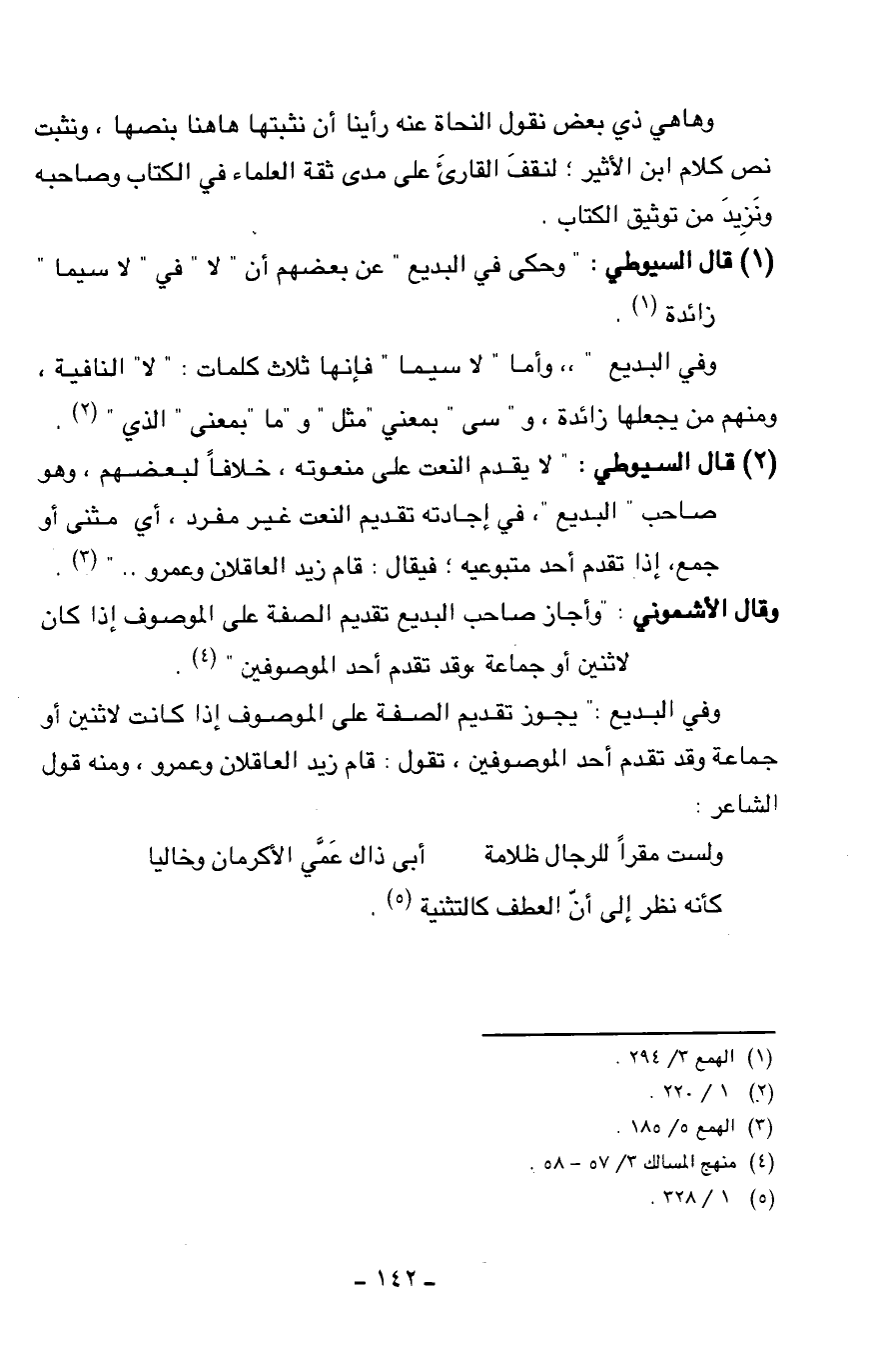 2 - قال السيوطي:" لا يقدم النعت على منعوته، خلافا لبعضهم، وهو صاحب" البديع"، في إجادته تقديم النعت غير مفرد، أي مثنى أو جمع، إذا تقدم أحد متبوعيه؛ فيقال: قام زيد العاقلان وعمرو .. " (¬3).