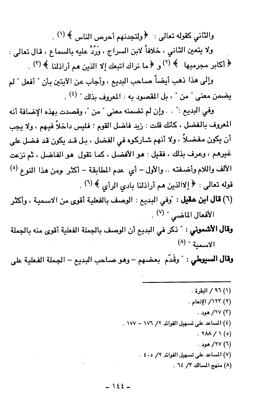 6 - قال ابن عقيل:" وفي البديع: الوصف بالفعلية أقوى من الاسمية، وأكثر الأفعال الماضي" (¬7).