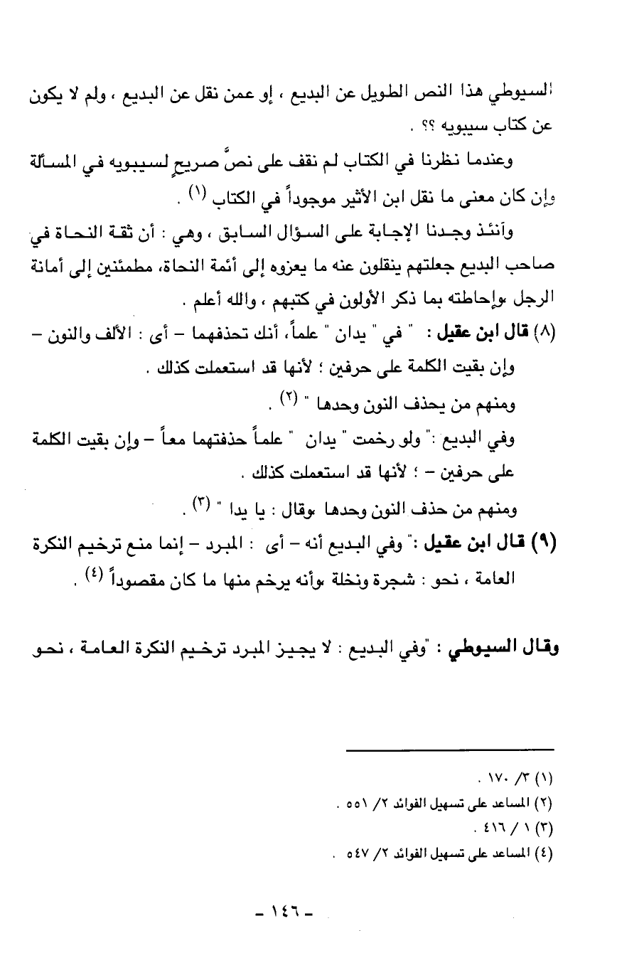 9 - قال ابن عقيل:" وفي البديع أنه - أى: المبرد - إنما منع ترخيم النكرة العامة، نحو: شجرة ونخلة، وأنه يرخم منها ما كان مقصودا (¬4).