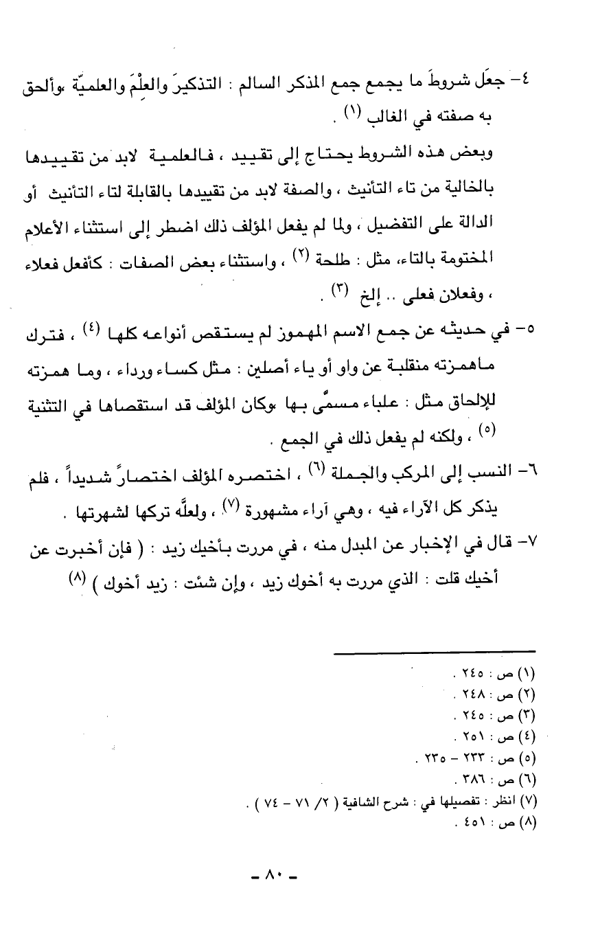 6 - النسب إلى المركب والجملة (¬6)، اختصره المؤلف اختصار شديدا، فلم يذكر كل الآراء فيه، وهي آراء مشهورة (¬7)، ولعلّه تركها لشهرتها.