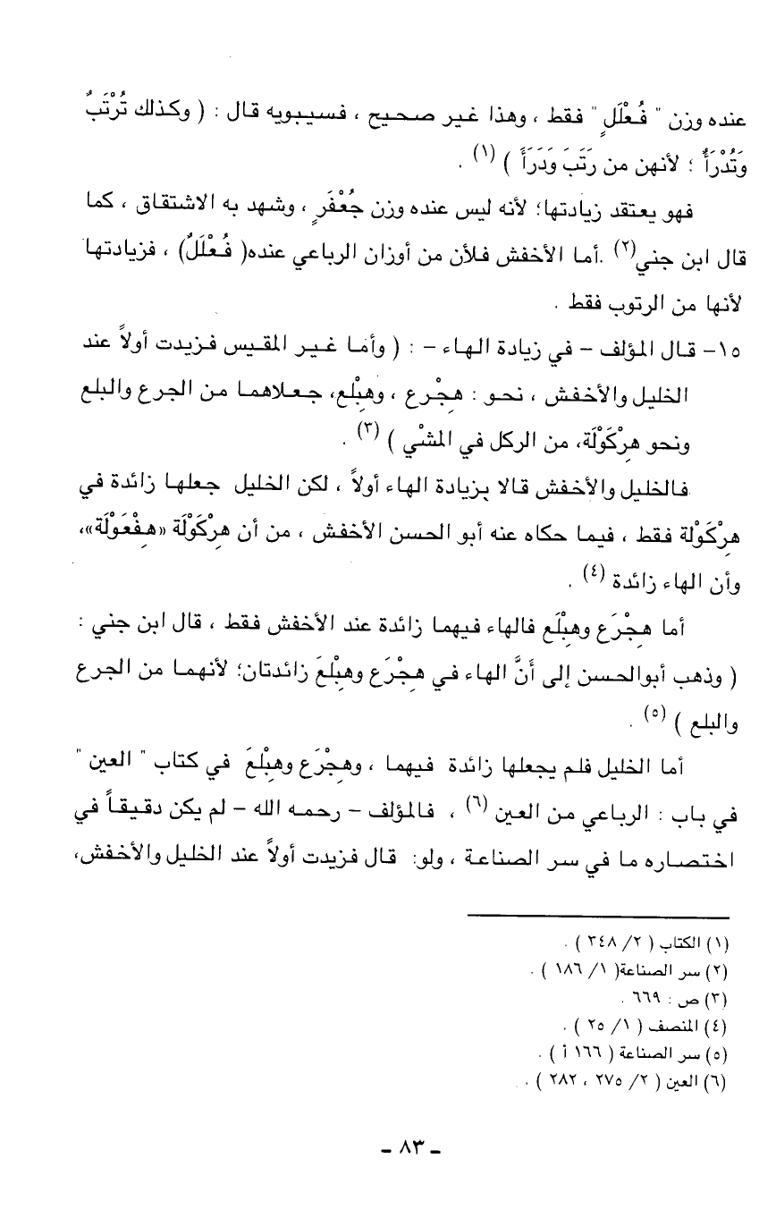 أما الخليل فلم يجعلها زائدة فيهما، وهجرع وهبلع في كتاب" العين" في باب: الرباعي من العين (¬6)، فالمؤلف - رحمه الله - لم يكن دقيقا في اختصاره ما في سر الصناعة، ولو: قال فزيدت أولا عند الخليل والأخفش،