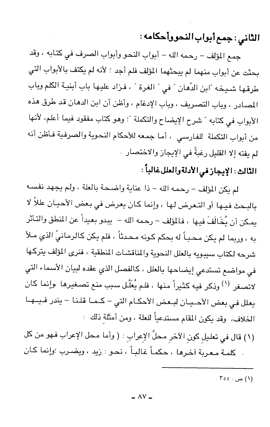 جمع المؤلف - رحمه الله - أبواب النحو وأبواب الصرف في كتابه، وقد بحثت عن أبواب منهما لم يبحثهما المؤلف فلم أجد؛ لأنه لم يكتف بالأبواب التي طرقها شيخه" ابن الدّهان" في" الغرة"، فزاد عليها باب أبنية الكلم وباب المصادر، وباب التصريف، وباب الإدغام، وأظن أن ابن الدهان قد طرق هذه الأبواب في كتابه" شرح الإيضاح والتكملة"؛ وهو كتاب مفقود فيما أعلم، لأنها من أبواب التكملة للفارسي، أما جمعه للأحكام النحوية والصرفية فأظن أنه لم يفته إلا القليل رغبة في الإيجاز والاختصار.