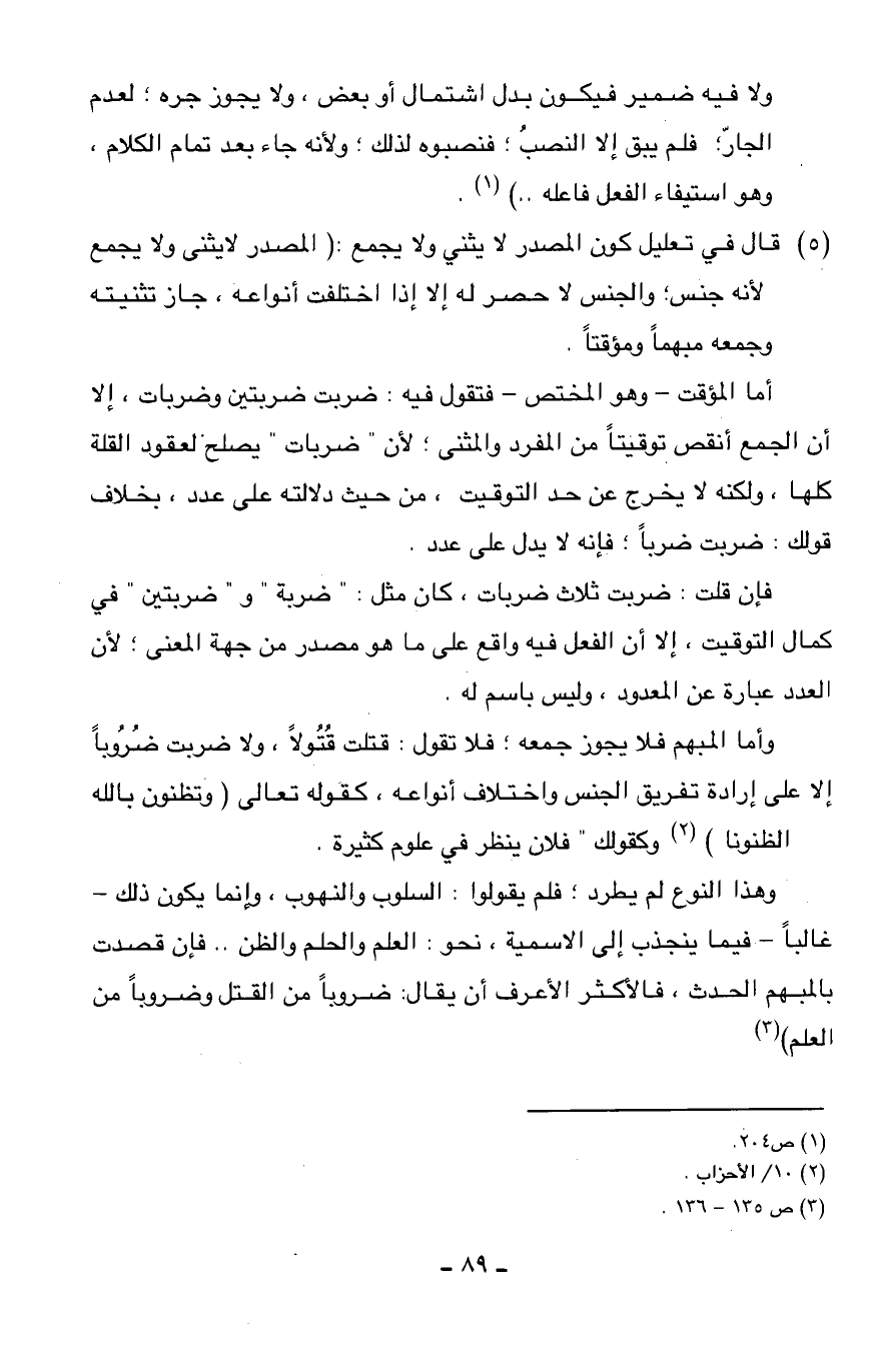 5 - قال في تعليل كون المصدر لا يثني ولا يجمع: (المصدر لا يثنى ولا يجمع لأنه جنس؛ والجنس لا حصر له إلا إذا اختلفت أنواعه، جاز تثنيته وجمعه مبهما ومؤقتا.