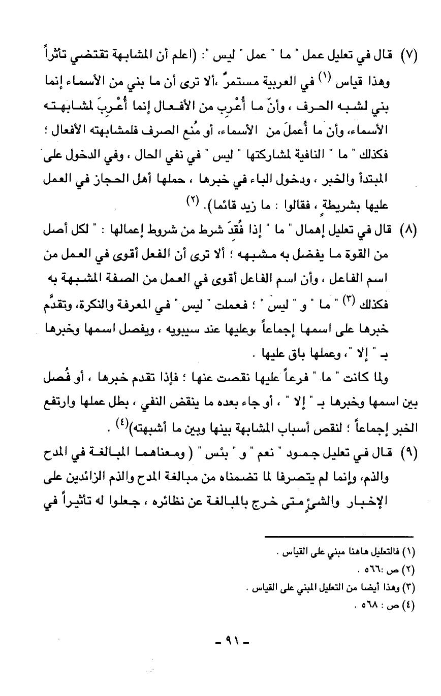 7 - قال في تعليل عمل" ما" عمل" ليس": (اعلم أن المشابهة تقتضي تأثرا وهذا قياس (¬1) في العربية مستمر، ألا ترى أن ما بني من الأسماء إنما بني لشبه الحرف، وأنّ ما أعرب من الأفعال إنما أعرب لمشابهته الأسماء، وأن ما أعمل من الأسماء، أو منع الصرف فلمشابهته الأفعال؛ فكذلك" ما" النافية لمشاركتها" ليس" في نفي الحال، وفي الدخول على المبتدأ والخبر، ودخول الباء في خبرها، حملها أهل الحجاز في العمل عليها بشريطة، فقالوا: ما زيد قائما). (¬2)