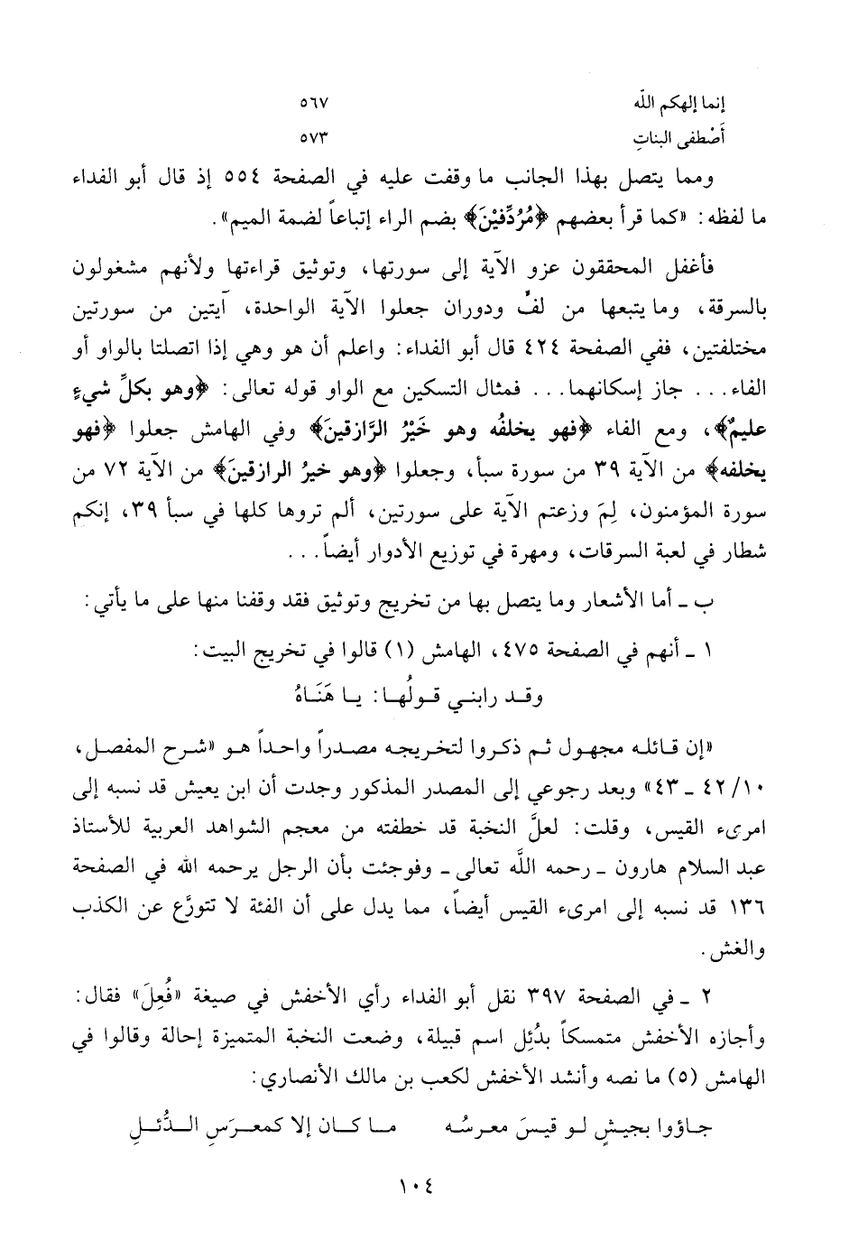 فأغفل المحققون عزو الآية إلى سورتها، وتوثيق قراءتها ولأنهم مشغولون بالسرقة، وما يتبعها من لفّ ودوران جعلوا الآية الواحدة، آيتين من سورتين مختلفتين، ففي الصفحة 424 قال أبو الفداء: واعلم أن هو وهي إذا اتصلتا بالواو أو الفاء ... جاز إسكانهما ... فمثال التسكين مع الواو قوله تعالى: وَهُوَ بِكُلِّ شَيْءٍ عَلِيمٌ،* ومع الفاء فَهُوَ يُخْلِفُهُ وَهُوَ خَيْرُ الرَّازِقِينَ وفي الهامش جعلوا فَهُوَ يُخْلِفُهُ من الآية 39 من سورة سبأ، وجعلوا وَهُوَ خَيْرُ الرَّازِقِينَ من الآية 72 من سورة المؤمنون، لم وزعتم الآية على سورتين، ألم تروها كلها في سبأ 39، إنكم شطار في لعبة السرقات، ومهرة في توزيع الأدوار أيضا ...