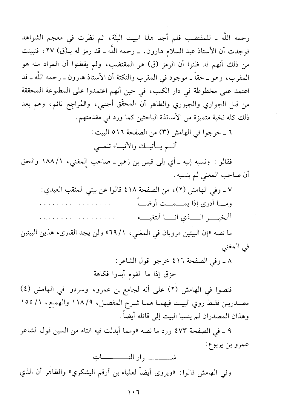 رحمه الله - للمقتضب فلم أجد هذا البيت البتّة، ثم نظرت في معجم الشواهد فوجدت أن الأستاذ عبد السّلام هارون، - رحمه الله - قد رمز له ب (ق) 27، فتبينت من ذلك أنهم قد ظنوا أن الرمز (ق) هو المقتضب، ولم يفطنوا أن المراد منه هو المقرب، وهو - حقا - موجود في المقرب والنكتة أن الأستاذ هارون - رحمه الله - قد اعتمد على مخطوطة في دار الكتب، في حين أنهم اعتمدوا على المطبوعة المحققة من قبل الجواري والجبوري والظاهر أن