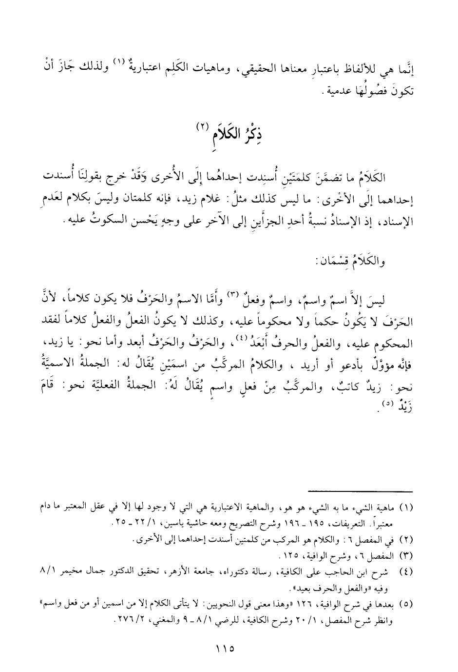 (¬5) بعدها في شرح الوافية، 126 «وهذا معنى قول النحويين: لا يتأتى الكلام إلا من اسمين أو من فعل واسم» وانظر شرح المفصل، 1/ 20 وشرح الكافية، للرضي 1/ 8 - 9 والمغني، 2/ 276.
