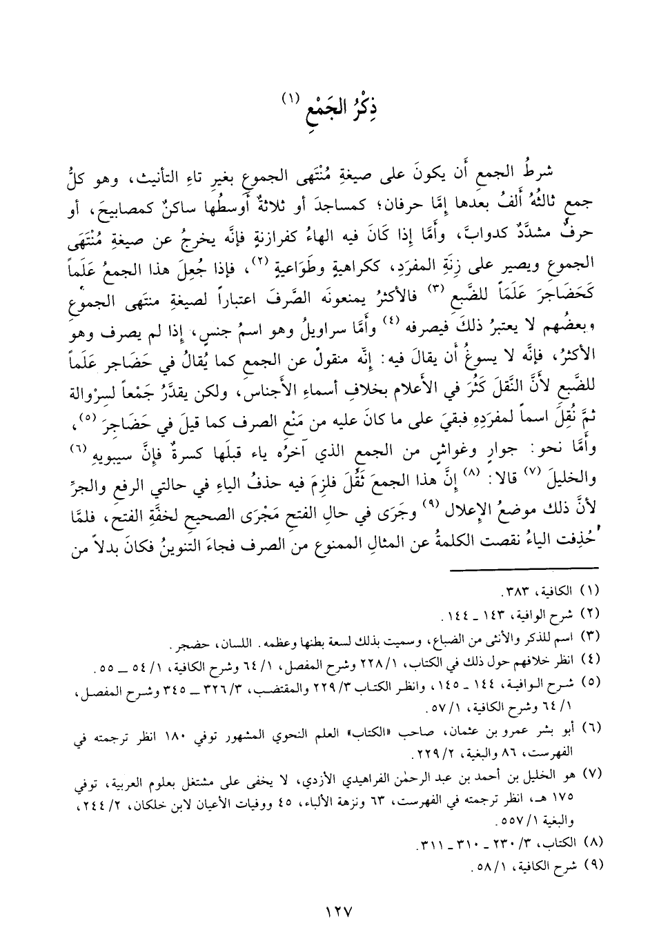 شرط الجمع أن يكون على صيغة منتهى الجموع بغير تاء التأنيث، وهو كلّ جمع ثالثه ألف بعدها إمّا حرفان؛ كمساجد أو ثلاثة أوسطها ساكن كمصابيح، أو حرف مشدّد كدوابّ، وأمّا إذا كان فيه الهاء كفرازنة فإنّه يخرج عن صيغة منتهى الجموع ويصير على زنة المفرد، ككراهية وطواعية (¬2)، فإذا جعل هذا الجمع علما كحضاجر علما للضّبع (¬3) فالأكثر يمنعونه الصّرف اعتبارا لصيغة منتهى الجموع وبعضهم لا يعتبر ذلك فيصرفه (¬4) وأمّا سراويل وهو اسم جنس، إذا لم يصرف وهو الأكثر، فإنّه لا يسوغ أن يقال فيه: إنّه منقول عن الجمع كما يقال في حضاجر علما للضّبع لأنّ النّقل كثر في الأعلام بخلاف أسماء الأجناس، ولكن يقدّر جمعا لسروالة ثمّ نقل اسما لمفرده فبقي على ما كان عليه من منع الصرف كما قيل في حضاجر (¬5)، وأمّا نحو: جوار وغواش من الجمع الذي آخره ياء قبلها كسرة فإنّ سيبويه (¬6) والخليل (¬7) قالا: (¬8) إنّ هذا الجمع ثقّل فلزم فيه حذف الياء في حالتي الرفع والجرّ لأنّ ذلك موضع الإعلال (¬9) وجرى في حال الفتح مجرى الصحيح لخفّة الفتح، فلمّا حذفت الياء نقصت الكلمة عن المثال الممنوع من الصرف فجاء التنوين فكان بدلا من