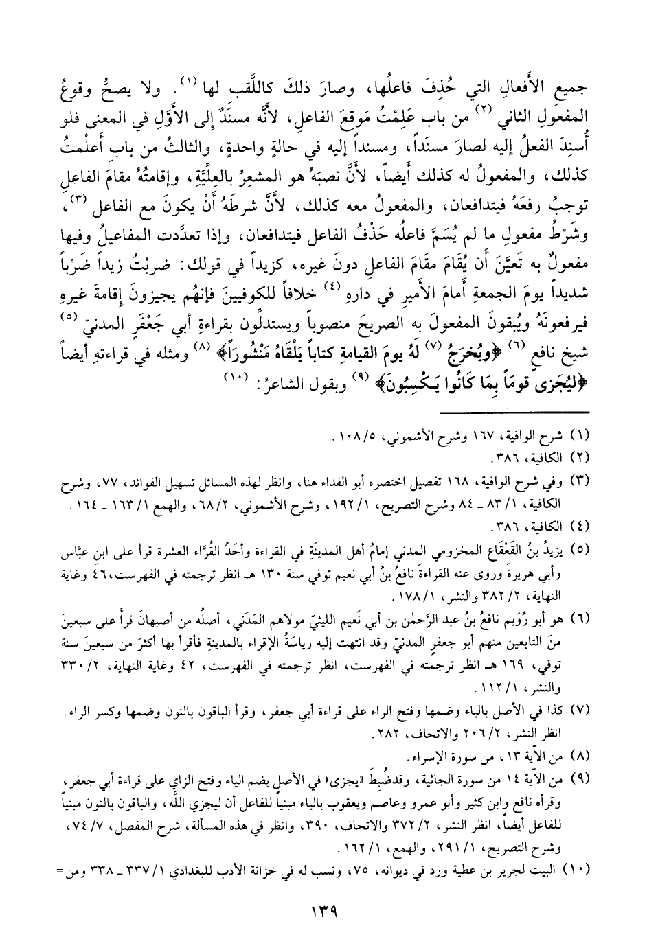 جميع الأفعال التي حذف فاعلها، وصار ذلك كاللّقب لها (¬1). ولا يصحّ وقوع المفعول الثاني (¬2) من باب علمت موقع الفاعل، لأنّه مسند إلى الأوّل في المعنى فلو أسند الفعل إليه لصار مسندا، ومسندا إليه في حالة واحدة، والثالث من باب أعلمت كذلك، والمفعول له كذلك أيضا، لأنّ نصبه هو المشعر بالعلّيّة، وإقامته مقام الفاعل توجب رفعه فيتدافعان، والمفعول معه كذلك، لأنّ شرطه أن يكون مع الفاعل (¬3)، وشرط مفعول ما لم يسمّ فاعله حذف الفاعل فيتدافعان، وإذا تعدّدت المفاعيل وفيها مفعول به تعيّن أن يقام مقام الفاعل دون غيره، كزيدا في قولك: ضربت زيدا ضربا شديدا يوم الجمعة أمام الأمير في داره (¬4) خلافا للكوفيين فإنهم يجيزون إقامة غيره فيرفعونه ويبقون المفعول به الصريح منصوبا ويستدلّون بقراءة أبي جعفر المدنيّ (¬5) شيخ نافع (¬6) ويخرج (¬7) له يوم القيامة كتابا يلقاه منشورا (¬8) ومثله في قراءته أيضا لِيَجْزِيَ قَوْماً بِما كانُوا يَكْسِبُونَ (¬9) وبقول الشاعر: (¬10)