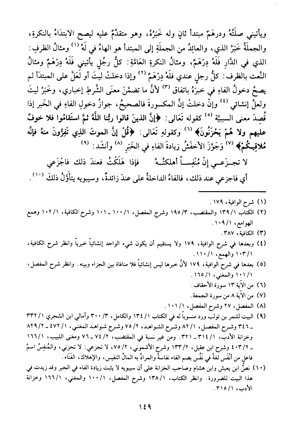 (¬10) نصّ ابن يعيش وابن هشام وصاحب الخزانة على أن سيبويه لا يثبت زيادة الفاء في الخبر وقد زيدت في هذا البيت للضرورة. وانظر الكتاب، 1/ 138 وشرح المفصل، 1/ 100 والمغني، 1/ 166 وخزانة الأدب، 1/ 315.