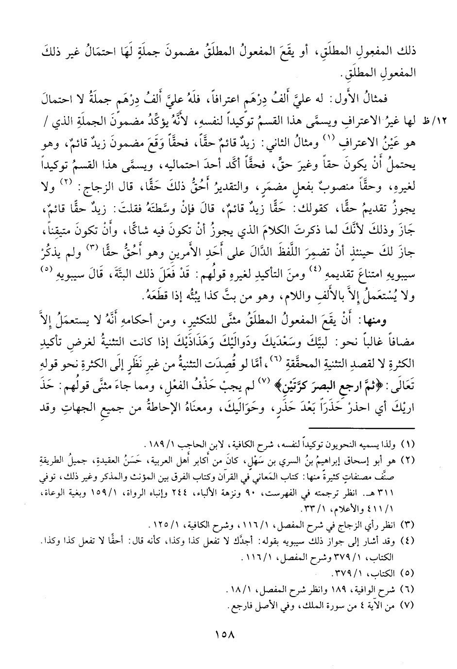 ومنها: أن يقع المفعول المطلق مثنّى للتكثير، ومن أحكامه أنّه لا يستعمل إلّا مضافا غالبا نحو: لبّيك وسعديك ودواليك وهذاذيك إذا كانت التثنية لغرض تأكيد الكثرة لا لقصد التثنية المحقّقة (¬6)، أمّا لو قصدت التثنية من غير نظر إلى الكثرة نحو قوله تعالى: ثُمَّ ارْجِعِ الْبَصَرَ كَرَّتَيْنِ (¬7) لم يجب حذف الفعل، ومما جاء مثنّى قولهم: حذ اريك أي احذر حذرا بعد حذر، وحواليك، ومعناه الإحاطة من جميع الجهات وقد