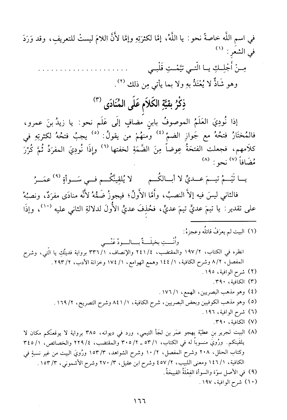 فالثاني ليس فيه إلّا النصب، وأمّا الأول؛ فيجوز ضمّه لأنّه منادى مفرد، ونصبه على تقدير: يا تيم عديّ تيم عديّ، فحذف عديّ الأول لدلالة الثاني عليه (¬10)، وإذا