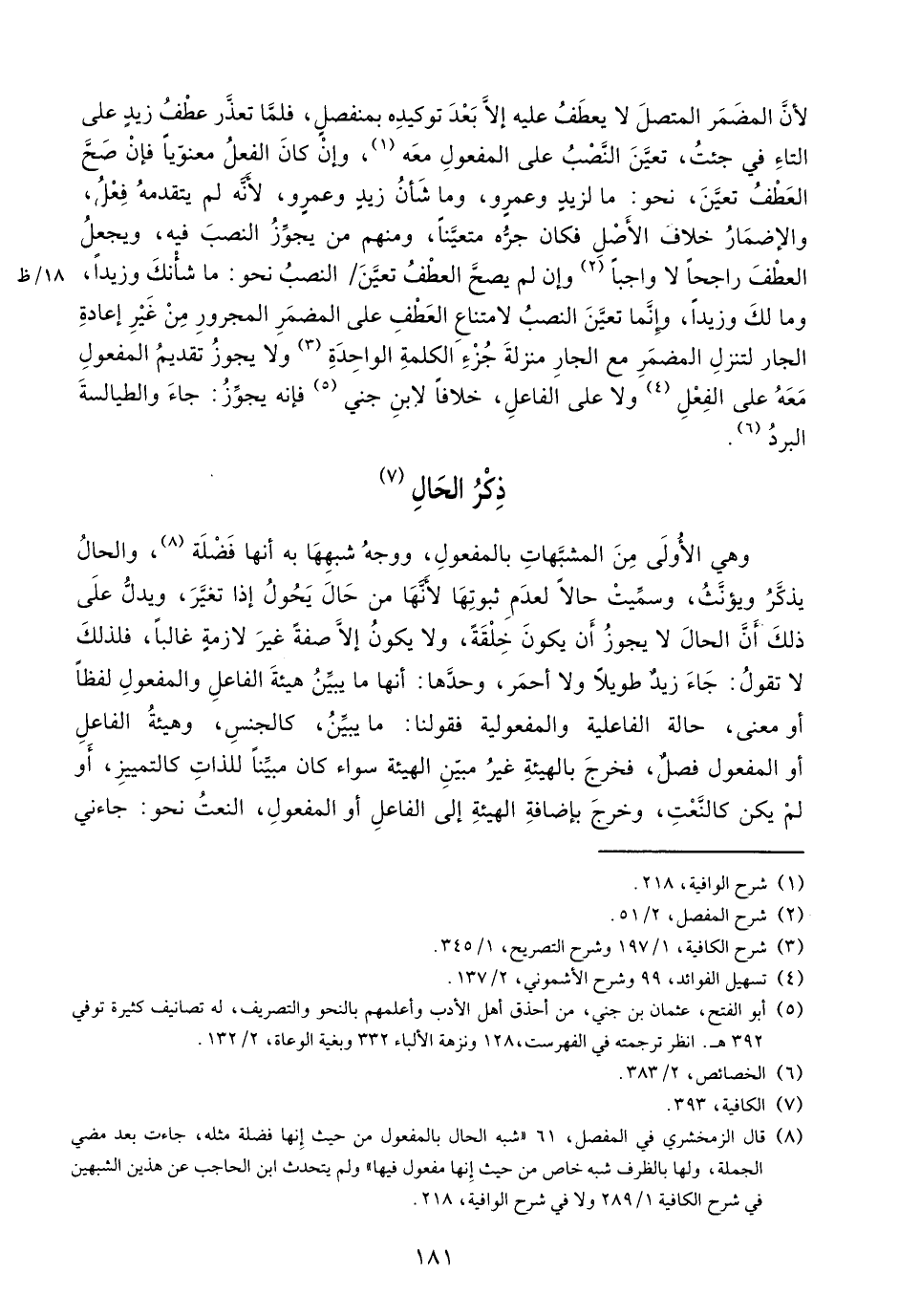 (¬8) قال الزمخشري في المفصل، 61 «شبه الحال بالمفعول من حيث إنها فضلة مثله، جاءت بعد مضي الجملة، ولها بالظرف شبه خاص من حيث إنها مفعول فيها» ولم يتحدث ابن الحاجب عن هذين الشبهين في شرح الكافية 1/ 289 ولا في شرح الوافية، 218.