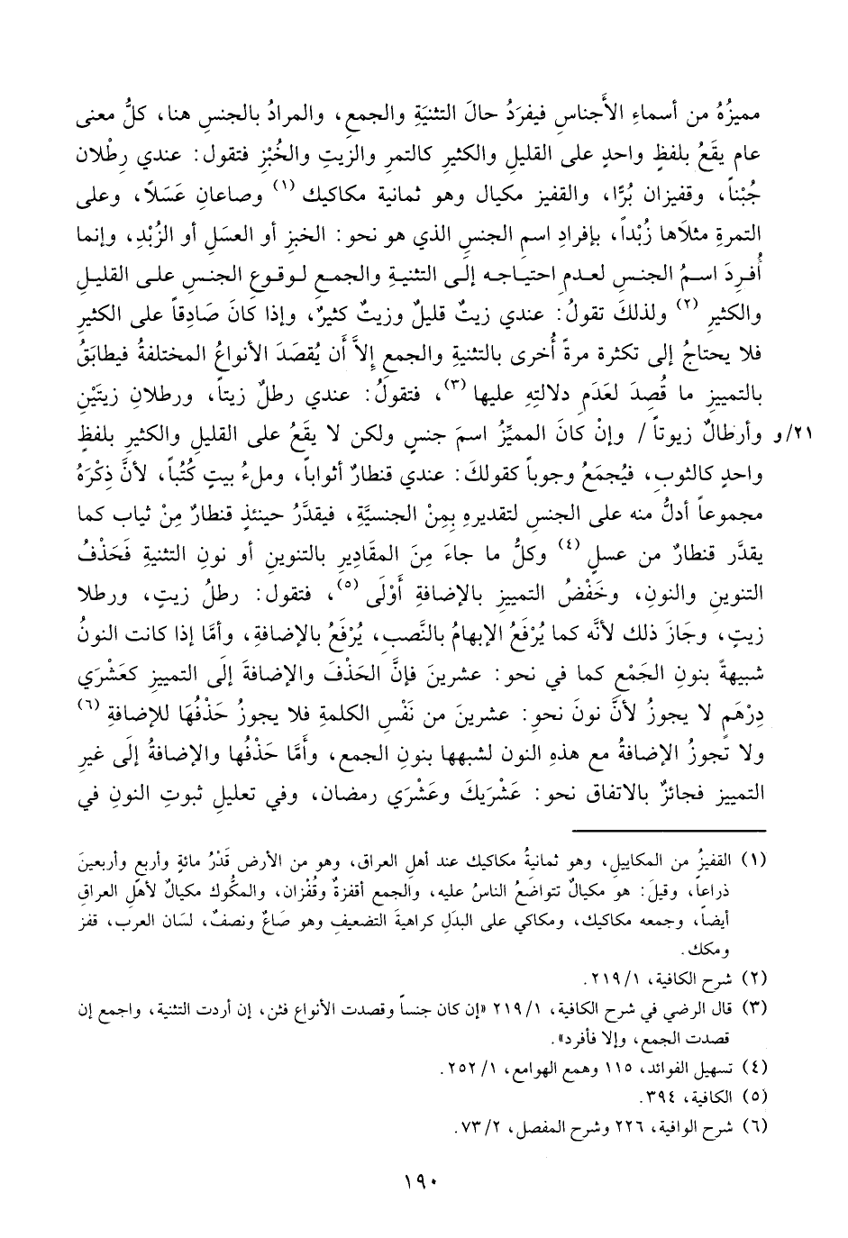 (¬3) قال الرضي في شرح الكافية، 1/ 219 «إن كان جنسا وقصدت الأنواع فثن، إن أردت التثنية، واجمع إن قصدت الجمع، وإلا فأفرد».
