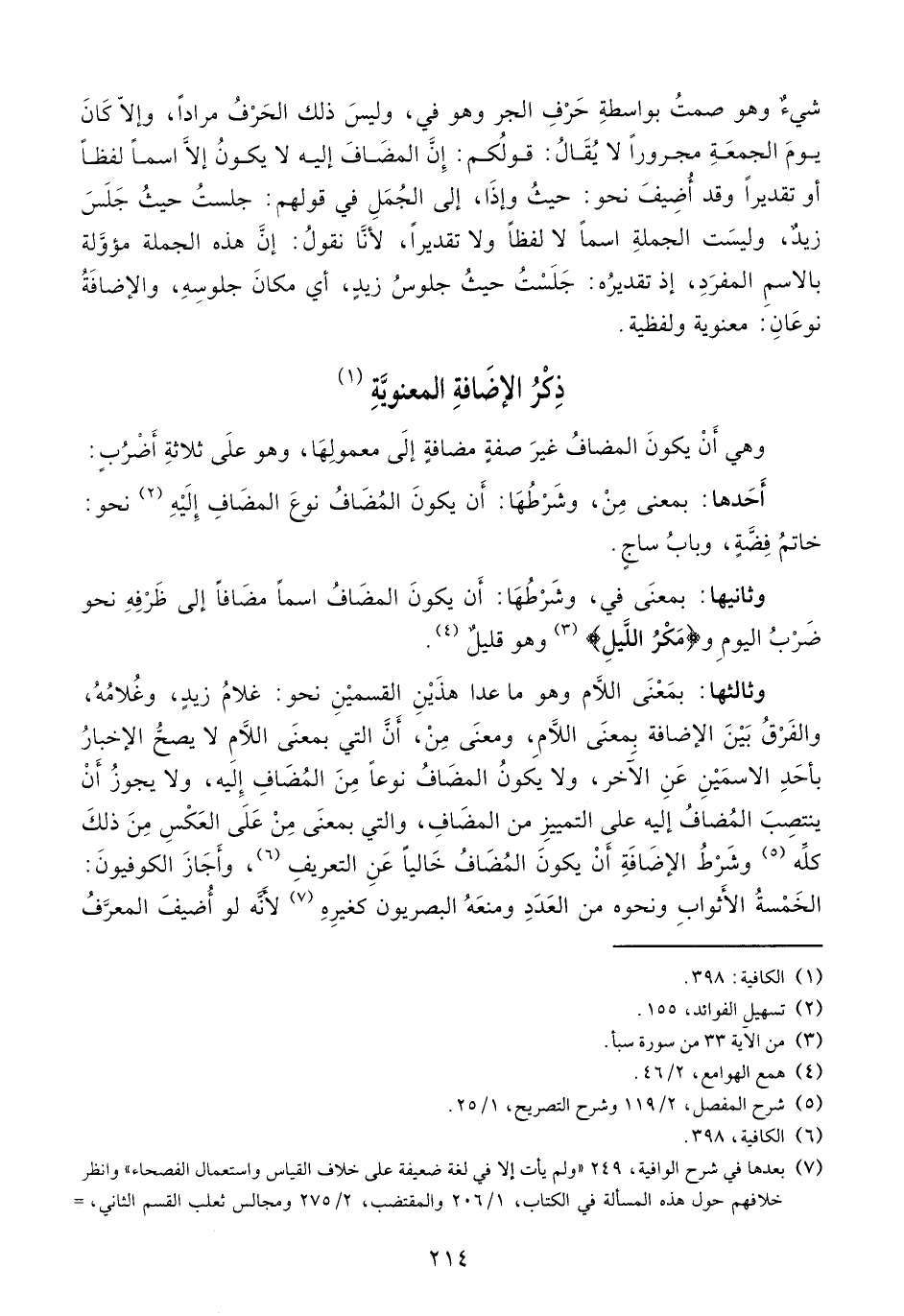 شيء وهو صمت بواسطة حرف الجر وهو في، وليس ذلك الحرف مرادا، وإلّا كان يوم الجمعة مجرورا لا يقال: قولكم: إنّ المضاف إليه لا يكون إلّا اسما لفظا أو تقديرا وقد أضيف نحو: حيث وإذا، إلى الجمل في قولهم: جلست حيث جلس زيد، وليست الجملة اسما لا لفظا ولا تقديرا، لأنّا نقول: إنّ هذه الجملة مؤوّلة بالاسم المفرد، إذ تقديره: جلست حيث جلوس زيد، أي مكان جلوسه، والإضافة نوعان: معنوية ولفظية.
