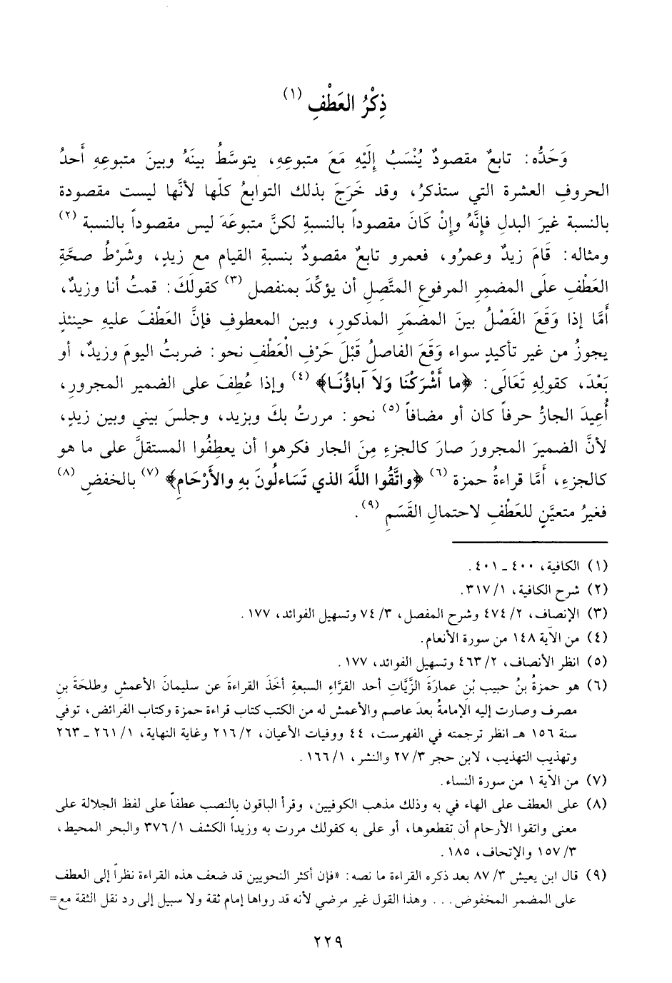 وحدّه: تابع مقصود ينسب إليه مع متبوعه، يتوسّط بينه وبين متبوعه أحد الحروف العشرة التي ستذكر، وقد خرج بذلك التوابع كلّها لأنّها ليست مقصودة بالنسبة غير البدل فإنّه وإن كان مقصودا بالنسبة لكنّ متبوعه ليس مقصودا بالنسبة (¬2) ومثاله: قام زيد وعمرو، فعمرو تابع مقصود بنسبة القيام مع زيد، وشرط صحّة العطف على المضمر المرفوع المتّصل أن يؤكّد بمنفصل (¬3) كقولك: قمت أنا وزيد، أمّا إذا وقع الفصل بين المضمر المذكور، وبين المعطوف فإنّ العطف عليه حينئذ يجوز من غير تأكيد سواء وقع الفاصل قبل حرف العطف نحو: ضربت اليوم وزيد، أو بعد، كقوله تعالى: ما أَشْرَكْنا وَلا آباؤُنا (¬4) وإذا عطف على الضمير المجرور، أعيد الجارّ حرفا كان أو مضافا (¬5) نحو: مررت بك وبزيد، وجلس بيني وبين زيد، لأنّ الضمير المجرور صار كالجزء من الجار فكرهوا أن يعطفوا المستقلّ على ما هو كالجزء، أمّا قراءة حمزة (¬6) واتقوا الله الذي تسائلون به والأرحام (¬7) بالخفض (¬8) فغير متعيّن للعطف لاحتمال القسم (¬9).