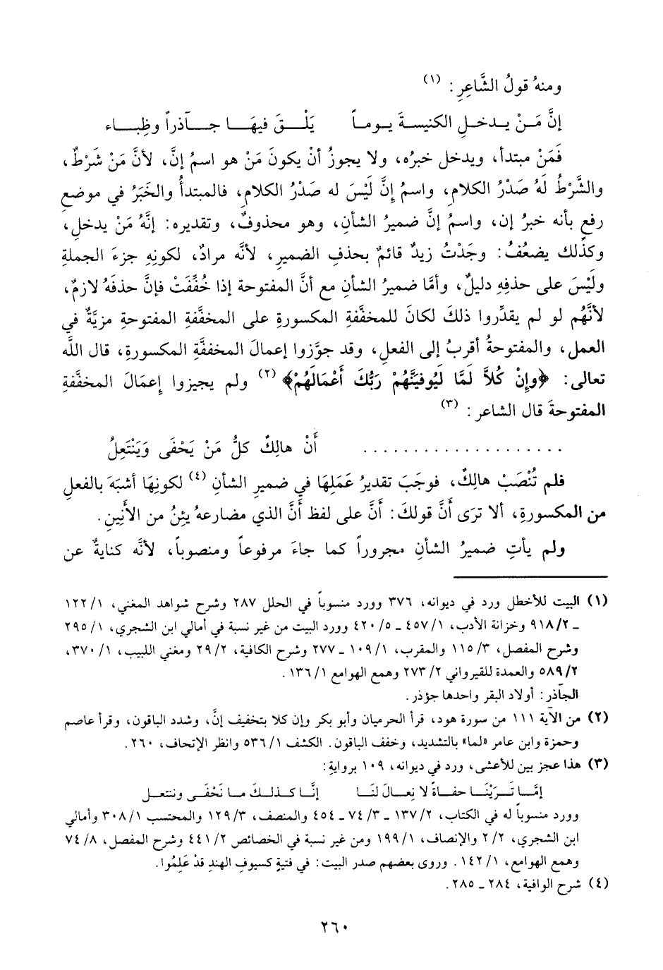 فمن مبتدأ، ويدخل خبره، ولا يجوز أن يكون من هو اسم إنّ، لأنّ من شرط، والشّرط له صدر الكلام، واسم إنّ ليس له صدر الكلام، فالمبتدأ والخبر في موضع رفع بأنه خبر إن، واسم إنّ ضمير الشأن، وهو محذوف، وتقديره: إنّه من يدخل، وكذلك يضعف: وجدت زيد قائم بحذف الضمير، لأنّه مراد، لكونه جزء الجملة وليس على حذفه دليل، وأمّا ضمير الشأن مع أنّ المفتوحة إذا خفّفت فإنّ حذفه لازم، لأنّهم لو لم يقدّروا ذلك لكان للمخفّفة المكسورة على المخفّفة المفتوحة مزيّة في العمل، والمفتوحة أقرب إلى الفعل، وقد جوّزوا إعمال المخفّفة المكسورة، قال الله تعالى: وَإِنَّ كُلًّا لَمَّا لَيُوَفِّيَنَّهُمْ رَبُّكَ أَعْمالَهُمْ (¬2) ولم يجيزوا إعمال المخفّفة المفتوحة قال الشاعر: (¬3)