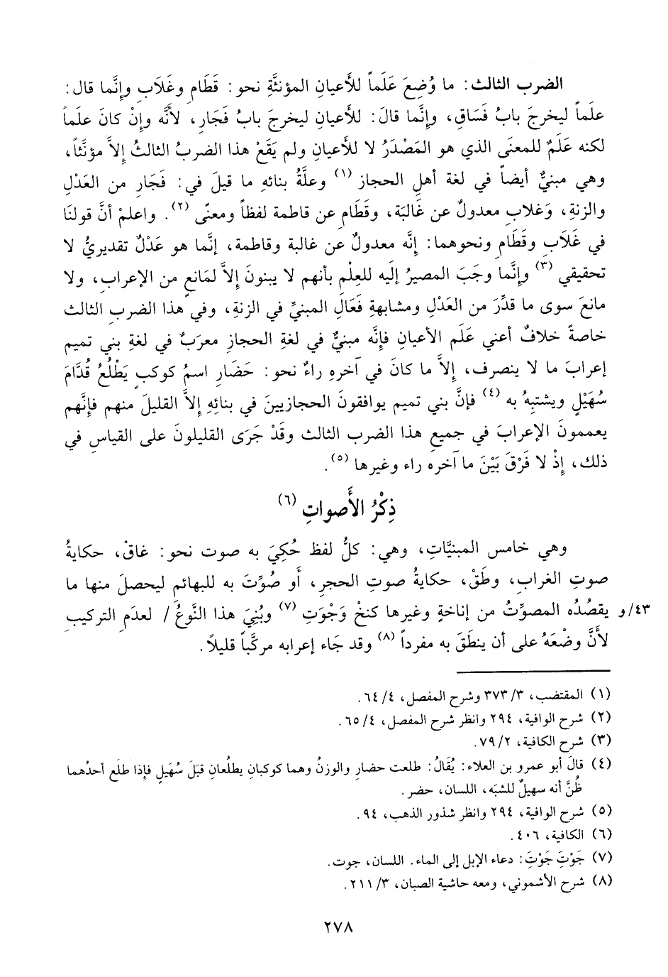 علما ليخرج باب فساق، وإنّما قال: للأعيان ليخرج باب فجار، لأنّه وإن كان علما لكنه علم للمعنى الذي هو المصدر لا للأعيان ولم يقع هذا الضرب الثالث إلّا مؤنّثا، وهي مبنيّ أيضا في لغة أهل الحجاز (¬1) وعلّة بنائه ما قيل في: فجار من العدل والزنة، وغلاب معدول عن غالبة، وقطام عن قاطمة لفظا ومعنى (¬2). واعلم أنّ قولنا في غلاب وقطام ونحوهما: إنّه معدول عن غالبة وقاطمة، إنّما هو عدل تقديريّ لا تحقيقي (¬3) وإنّما وجب المصير إليه للعلم بأنهم لا يبنون إلّا لمانع من الإعراب، ولا مانع سوى ما قدّر من العدل ومشابهة فعال المبنيّ في الزنة، وفي هذا الضرب الثالث خاصة خلاف أعني علم الأعيان فإنّه مبنيّ في لغة الحجاز معرب في لغة بني تميم إعراب ما لا ينصرف، إلّا ما كان في آخره راء نحو: حضار اسم كوكب يطلع قدّام سهيل ويشتبه به (¬4) فإنّ بني تميم يوافقون الحجازيين في بنائه إلّا القليل منهم فإنّهم يعممون الإعراب في جميع هذا الضرب الثالث وقد جرى القليلون على القياس في ذلك، إذ لا فرق بين ما آخره راء وغيرها (¬5).
