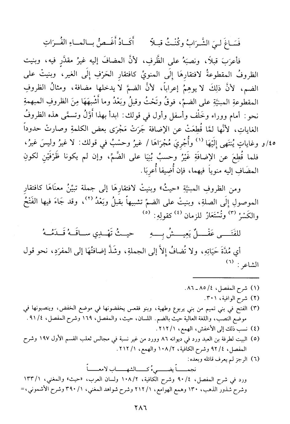 (¬3) الفتح في بني تميم من بني يربوع وطهية، وبنو فقعس يخفضونها في موضع الخفض، وينصبونها في موضع النصب، واللغة العالية حيث بالضم. اللسان، حيث، والمفصل، 169 وشرح المفصل، 4/ 91.