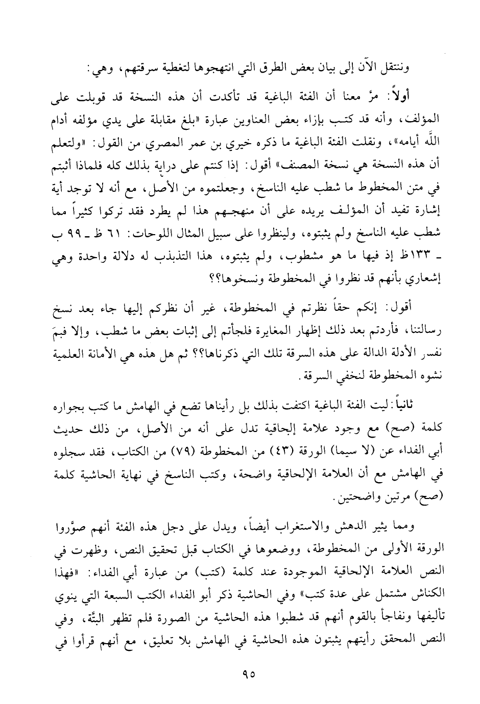 أولا: مرّ معنا أن الفئة الباغية قد تأكدت أن هذه النسخة قد قوبلت على المؤلف، وأنه قد كتب بإزاء بعض العناوين عبارة «بلغ مقابلة على يدي مؤلفه أدام الله أيامه»، ونقلت الفئة الباغية ما ذكره خيري بن عمر المصري من القول: «ولتعلم أن هذه النسخة هي نسخة المصنف» أقول: إذا كنتم على دراية بذلك كله فلماذا أثبتم في متن المخطوط ما شطب عليه الناسخ، وجعلتموه من الأصل، مع أنه لا توجد أية إشارة تفيد أن المؤلف يريده على أن منهجهم هذا لم يطرد فقد تركوا كثيرا مما شطب عليه الناسخ ولم يثبتوه، ولينظروا على سبيل المثال اللوحات: 61 ظ - 99 ب - 133 ظ إذ فيها ما هو مشطوب، ولم يثبتوه، هذا التذبذب له دلالة واحدة وهي إشعاري بأنهم قد نظروا في المخطوطة ونسخوها؟؟