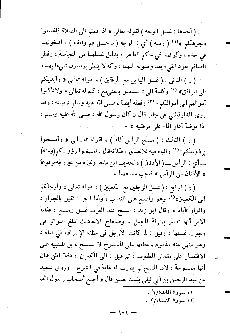 (وَ) الرَّابِعُ: (غَسْلُ الرِّجْلَيْنِ مَعَ الْكَعْبَيْنِ) لِقَوْلِهِ تَعَالَى {وَأَرْجُلَكُمْ إِلَى الْكَعْبَيْنِ} [المائدة: 6] وَهُوَ وَاضِحٌ عَلَى النَّصْبِ، وَأَمَّا الْجَرُّ: فَقِيلَ بِالْجِوَارِ، وَالْوَاوُ تَأْبَاهُ. وَقَالَ أَبُو زَيْدٍ: الْمَسْحُ عِنْدَ الْعَرَبِ غَسْلٌ وَمَسْحٌ، فَغَايَةُ الْأَمْرِ أَنَّهَا تَصِيرُ بِمَنْزِلَةِ الْمُجْمَلِ. وَصِحَاحُ الْأَحَادِيثِ تَبْلُغُ التَّوَاتُرَ فِي وُجُوبِ غَسْلِهَا، وَقِيلَ: لَمَّا كَانَتْ الْأَرْجُلُ فِي مَظِنَّةِ الْإِسْرَافِ فِي الْمَاءِ، وَهُوَ مَنْهِيٌّ عَنْهُ مَذْمُومٌ، عَطَفَهَا عَلَى الْمَمْسُوحِ لَا لِتُمْسَحَ، بَلْ لِلتَّنْبِيهِ عَلَى الِاقْتِصَارِ عَلَى مِقْدَارِ الْمَطْلُوبِ، ثُمَّ قِيلَ: إلَى الْكَعْبَيْنِ، دَفْعًا لِظَنِّ ظَانٍّ أَنَّهَا مَمْسُوحَةٌ، لِأَنَّ الْمَسْحَ لَمْ يُضْرَبْ لَهُ غَايَةٌ فِي الشَّرْعِ. وَرَوَى سَعِيدٌ عَنْ عَبْدِ الرَّحْمَنِ بْنِ أَبِي لَيْلَى بِسَنَدٍ حَسَنٍ قَالَ " أَجْمَعَ أَصْحَابُ رَسُولِ اللَّهِ