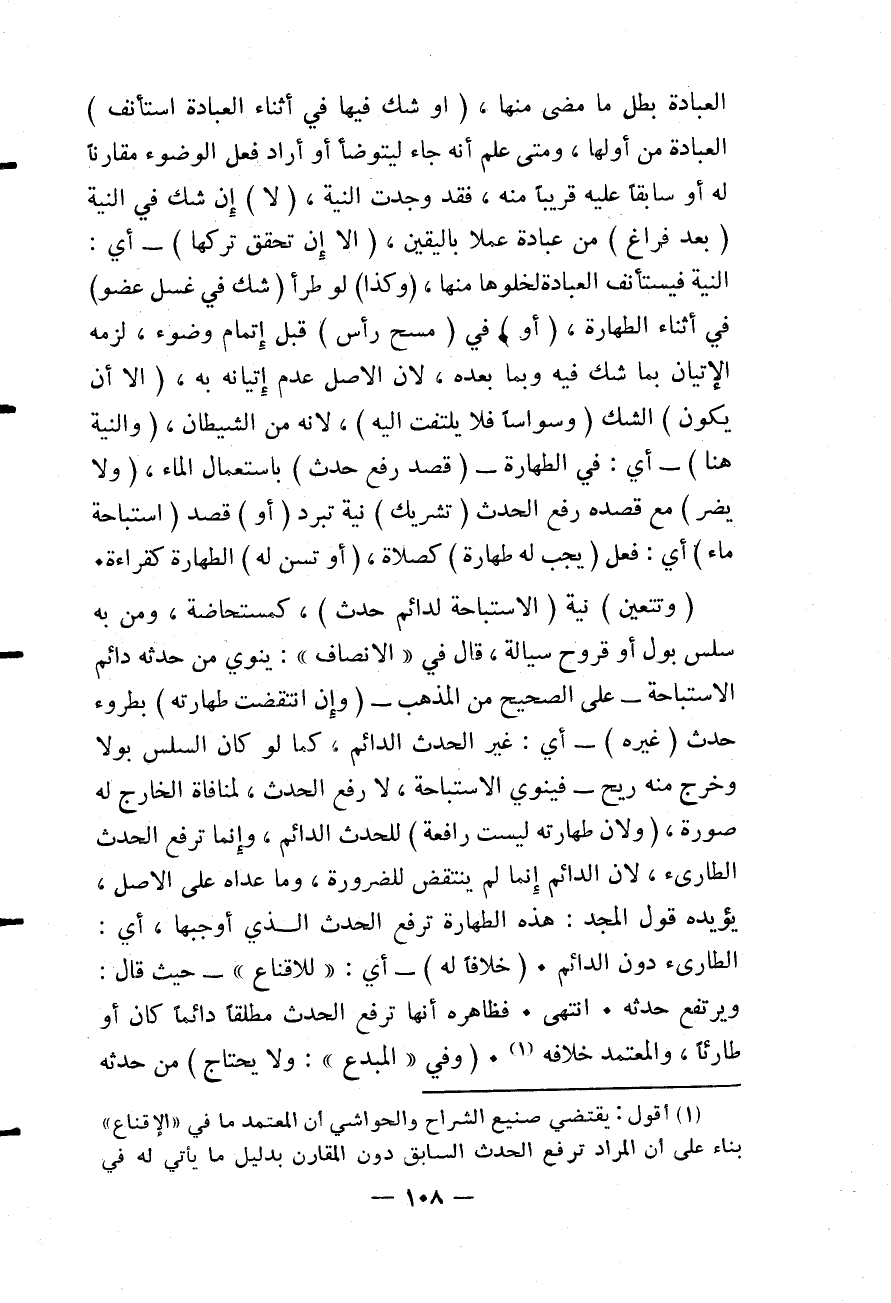 (وَتَتَعَيَّنُ) نِيَّةُ (الِاسْتِبَاحَةِ لِدَائِمِ حَدَثٍ) ، كَمُسْتَحَاضَةٍ، وَمَنْ بِهِ سَلَسُ بَوْلٍ أَوْ قُرُوحٌ سَيَّالَةٌ، قَالَ فِي الْإِنْصَافِ ": يَنْوِي مَنْ حَدَثُهُ دَائِمُ الِاسْتِبَاحَةِ - عَلَى الصَّحِيحِ مِنْ الْمَذْهَبِ - (وَإِنْ انْتَقَضَتْ طَهَارَتُهُ) بِطُرُوءِ حَدَثٍ (غَيْرِهِ) - أَيْ: غَيْرِ الْحَدَثِ الدَّائِمِ، كَمَا لَوْ كَانَ السَّلَسُ بَوْلًا وَخَرَجَ مِنْهُ رِيحٌ - فَيَنْوِي الِاسْتِبَاحَةَ، لَا رَفْعَ الْحَدَثِ، لِمُنَافَاةِ الْخَارِجِ لَهُ صُورَةً، (وَلِأَنَّ طَهَارَتَهُ لَيْسَتْ رَافِعَةً) لِلْحَدَثِ الدَّائِمِ، وَإِنَّمَا تَرْفَعُ الْحَدَثَ الطَّارِئَ، لِأَنَّ الدَّائِمَ إنَّمَا لَمْ يُنْتَقَضْ لِلضَّرُورَةِ، وَمَا عَدَاهُ عَلَى الْأَصْلِ، يُؤَيِّدُهُ قَوْلُ الْمَجْدِ: هَذِهِ الطَّهَارَةُ تَرْفَعُ الْحَدَثَ الَّذِي أَوْجَبَهَا، أَيْ: الطَّارِئَ دُونَ الدَّائِمِ.