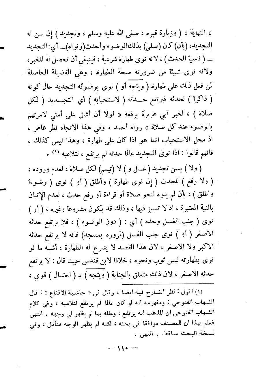 النِّهَايَةِ " (وَزِيَارَةِ قَبْرِهِ - صَلَّى اللَّهُ عَلَيْهِ وَسَلَّمَ - وَتَجْدِيدٍ) إنْ سُنَّ لَهُ التَّجْدِيدُ، (بِأَنْ) كَانَ (صَلَّى) بِذَلِكَ الْوُضُوءِ وَأَحْدَثَ (وَنَوَاهُ) - أَيْ: التَّجْدِيدَ - (نَاسِيًا الْحَدَثَ) ، لِأَنَّهُ نَوَى طَهَارَةً شَرْعِيَّةً، فَيَنْبَغِي أَنْ تَحْصُلَ لَهُ لِلْخَبَرِ، وَلِأَنَّهُ نَوَى شَيْئًا مِنْ ضَرُورَتِهِ صِحَّةُ الطَّهَارَةِ، وَهِيَ الْفَضِيلَةُ الْحَاصِلَةُ لِمَنْ فَعَلَ ذَلِكَ عَلَى طَهَارَةٍ (وَيَتَّجِهُ أَوْ) نَوَى بِوُضُوئِهِ التَّجْدِيدَ حَالَ كَوْنِهِ (ذَاكِرًا) لِحَدَثِهِ فَيَرْتَفِعُ حَدَثُهُ (لِاسْتِحْبَابِهِ) أَيْ التَّجْدِيدِ (لِكُلِّ صَلَاةٍ) ، لِخَبَرِ أَبِي هُرَيْرَةَ يَرْفَعُهُ «لَوْلَا أَنْ أَشُقَّ عَلَى أُمَّتِي لَأَمَرْتُهُمْ بِالْوُضُوءِ عِنْدَ كُلِّ صَلَاةٍ» رَوَاهُ أَحْمَدُ. وَفِي هَذَا الِاتِّجَاهِ نَظَرٌ ظَاهِرٌ، إذْ مَحَلُّ الِاسْتِحْبَابِ إنَّمَا هُوَ إذَا كَانَ عَلَى طَهَارَةٍ، وَهَذَا لَيْسَ كَذَلِكَ، فَإِنَّهُمْ قَالُوا: إذَا نَوَى التَّجْدِيدَ عَالِمًا حَدَثَهُ لَمْ يَرْتَفِعْ، لِتَلَاعُبِهِ.