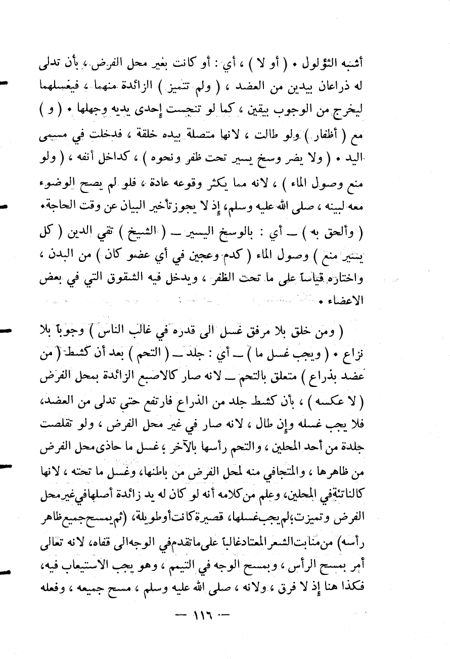 أَشْبَهَ الثُّؤْلُولَ. (أَوْ لَا) ، أَيْ: أَوْ كَانَتْ بِغَيْرِ مَحَلِّ الْفَرْضِ، بِأَنْ تَدَلَّى لَهُ ذِرَاعَانِ بِيَدَيْنِ مِنْ الْعَضُدِ، (وَلَمْ تَتَمَيَّزْ) الزَّائِدَةُ مِنْهُمَا، فَيَغْسِلُهُمَا لِيَخْرُجَ مِنْ الْوُجُوبِ بِيَقِينٍ، كَمَا لَوْ تَنَجَّسَتْ إحْدَى يَدَيْهِ وَجَهِلَهَا. (وَ) مَعَ (أَظْفَارٍ) وَلَوْ طَالَتْ، لِأَنَّهَا مُتَّصِلَةٌ بِيَدِهِ خِلْقَةً فَدَخَلَتْ فِي مُسَمَّى الْيَدِ. (وَلَا يَضُرُّ وَسَخٌ يَسِيرٌ تَحْتَ ظُفْرٍ وَنَحْوِهِ) ، كَدَاخِلِ أَنْفِهِ (وَلَوْ مَنَعَ وُصُولَ الْمَاءِ) ، لِأَنَّهُ مِمَّا يَكْثُرُ وُقُوعُهُ عَادَةً، فَلَوْ لَمْ يَصِحَّ الْوُضُوءُ مَعَهُ لَبَيَّنَهُ - صَلَّى اللَّهُ عَلَيْهِ وَسَلَّمَ - إذْ لَا يَجُوزُ تَأْخِيرُ الْبَيَانِ عَنْ وَقْتِ الْحَاجَةِ.