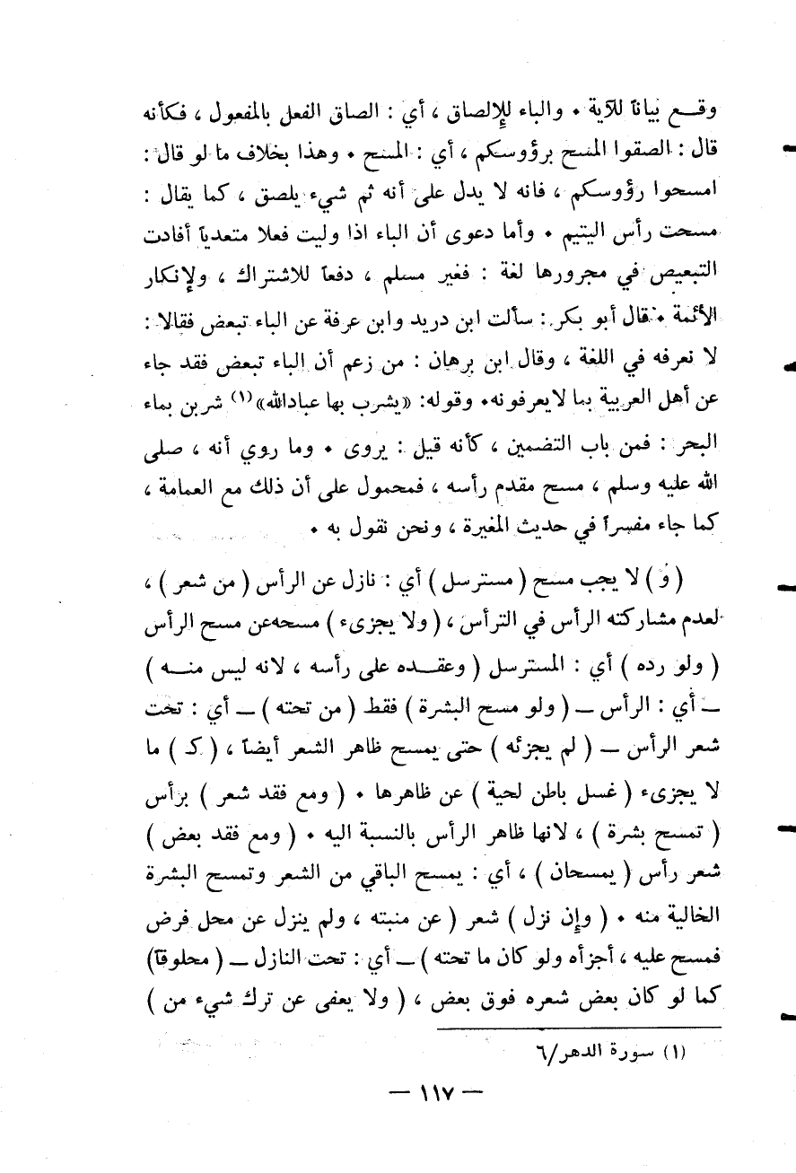 وَقَعَ بَيَانًا لِلْآيَةِ. وَالْبَاءُ لِلْإِلْصَاقِ، أَيْ: إلْصَاقِ الْفِعْلِ بِالْمَفْعُولِ، فَكَأَنَّهُ قَالَ: الْصَقُوا الْمَسْحَ بِرُءُوسِكُمْ، أَيْ: الْمَسْحَ. وَهَذَا بِخِلَافِ مَا لَوْ قَالَ: امْسَحُوا رُءُوسَكُمْ، فَإِنَّهُ لَا يَدُلُّ عَلَى أَنَّهُ ثَمَّ شَيْءٌ يُلْصَقُ، كَمَا يُقَالُ: مَسَحْتُ رَأْسَ الْيَتِيمِ. وَأَمَّا دَعْوَى أَنَّ الْبَاءَ إذَا وَلِيَتْ فِعْلًا مُتَعَدِّيًا أَفَادَتْ التَّبْعِيضَ فِي مَجْرُورِهَا لُغَةً: فَغَيْرُ مُسَلَّمٍ دَفْعًا لِلِاشْتِرَاكِ وَلِإِنْكَارِ الْأَئِمَّةِ. قَالَ أَبُو بَكْرٍ: سَأَلْتُ ابْنَ دُرَيْدٍ وَابْنَ عَرَفَةَ عَنْ الْبَاءِ تُبَعِّضُ فَقَالَا: لَا نَعْرِفُهُ فِي اللُّغَةِ، وَقَالَ ابْنُ بُرْهَانَ: مَنْ زَعَمَ أَنَّ الْبَاءَ تُبَعِّضُ فَقَدْ جَاءَ عَنْ أَهْلِ الْعَرَبِيَّةِ بِمَا لَا يَعْرِفُونَهُ. وَقَوْلُهُ: {يَشْرَبُ بِهَا عِبَادُ اللَّهِ} [الإنسان: 6] شَرِبْنَ بِمَاءِ الْبَحْرِ: فَمِنْ بَابِ التَّضْمِينِ، كَأَنَّهُ قِيلَ: يُرْوَى. وَمَا رُوِيَ «أَنَّهُ - صَلَّى اللَّهُ عَلَيْهِ وَسَلَّمَ - مَسَحَ مُقَدَّمَ رَأْسِهِ» ، فَمَحْمُولٌ عَلَى أَنَّ ذَلِكَ مَعَ الْعِمَامَةِ كَمَا جَاءَ مُفَسَّرًا فِي حَدِيثِ الْمُغِيرَةِ وَنَحْنُ نَقُولُ بِهِ.