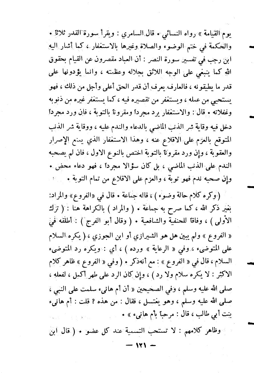 يَوْمِ الْقِيَامَةِ» رَوَاهُ النَّسَائِيّ. قَالَ السَّامِرِيُّ: وَيَقْرَأُ سُورَةَ الْقَدْرِ ثَلَاثًا. وَالْحِكْمَةُ فِي خَتْمِ الْوُضُوءِ وَالصَّلَاةِ وَغَيْرِهَا بِالِاسْتِغْفَارِ كَمَا أَشَارَ إلَيْهِ ابْنُ رَجَبٍ فِي تَفْسِيرِ سُورَةِ النَّصْرِ: أَنَّ الْعِبَادَ مُقَصِّرُونَ عَنْ الْقِيَامِ بِحُقُوقِ اللَّهِ كَمَا يَنْبَغِي عَلَى الْوَجْهِ اللَّائِقِ بِجَلَالِهِ وَعَظَمَتِهِ، وَإِنَّمَا يُؤَدُّونَهَا عَلَى قَدْرِ مَا يُطِيقُونَهُ، فَالْعَارِفُ يَعْرِفُ أَنَّ قَدْرَ الْحَقِّ أَعْلَى وَأَجَلُّ مِنْ ذَلِكَ، فَهُوَ يَسْتَحْيِي مِنْ عَمَلِهِ، وَيَسْتَغْفِرُ مِنْ تَقْصِيرِهِ فِيهِ، كَمَا يَسْتَغْفِرُ غَيْرُهُ مِنْ ذُنُوبِهِ وَغَفَلَاتِهِ. قَالَ: وَالِاسْتِغْفَارُ يَرِدُ مُجَرَّدًا وَمَقْرُونًا بِالتَّوْبَةِ، فَإِنْ وَرَدَ مُجَرَّدًا دَخَلَ فِيهِ وِقَايَةُ شَرِّ الذَّنْبِ الْمَاضِي بِالدُّعَاءِ وَالنَّدَمِ عَلَيْهِ، وَوِقَايَةُ شَرِّ الذَّنْبِ الْمُتَوَقَّعِ بِالْعَزْمِ عَلَى الْإِقْلَاعِ عَنْهُ، وَهَذَا الِاسْتِغْفَارُ الَّذِي يَمْنَعُ الْإِصْرَارَ وَالْعُقُوبَةَ، وَإِنْ وَرَدَ مَقْرُونًا بِالتَّوْبَةِ اخْتَصَّ بِالنَّوْعِ الْأَوَّلِ، فَإِنْ لَمْ يَصْحَبْهُ النَّدَمُ عَلَى الذَّنْبِ الْمَاضِي، بَلْ كَانَ سُؤَالًا مُجَرَّدًا، فَهُوَ دُعَاءٌ مَحْضٌ. وَإِنْ صَحِبَهُ نَدَمٌ فَهُوَ تَوْبَةٌ، وَالْعَزْمُ عَلَى الْإِقْلَاعِ مِنْ تَمَامِ التَّوْبَةِ.