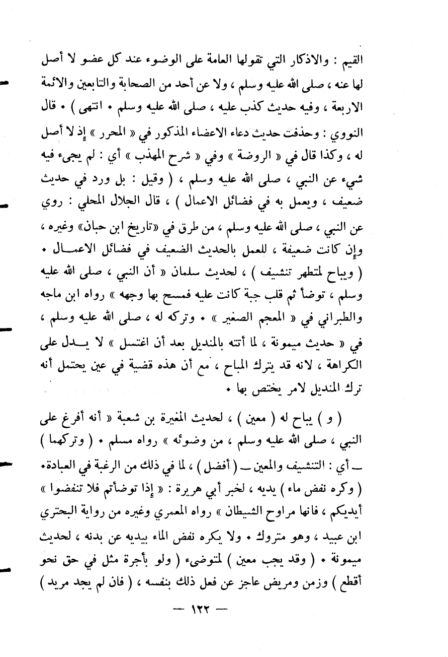 وَالْأَذْكَارُ الَّتِي تَقُولُهَا الْعَامَّةُ عَلَى الْوُضُوءِ عِنْدَ كُلِّ عُضْوٍ لَا أَصْلَ لَهَا عَنْهُ - صَلَّى اللَّهُ عَلَيْهِ وَسَلَّمَ - وَلَا عَنْ أَحَدٍ مِنْ الصَّحَابَةِ وَالتَّابِعِينَ وَالْأَئِمَّةِ الْأَرْبَعَةِ، وَفِيهِ حَدِيثٌ كُذِبَ عَلَيْهِ - صَلَّى اللَّهُ عَلَيْهِ وَسَلَّمَ -. انْتَهَى) . قَالَ النَّوَوِيُّ: وَحَذَفْت حَدِيثَ دُعَاءِ الْأَعْضَاءِ الْمَذْكُورِ فِي " الْمُحَرَّرِ " إذْ لَا أَصْلَ لَهُ، وَكَذَا قَالَ فِي " الرَّوْضَةِ " وَفِي " شَرْحِ الْمُهَذَّبِ " أَيْ: لَمْ يَجِئْ فِيهِ شَيْءٌ عَنْ النَّبِيِّ - صَلَّى اللَّهُ عَلَيْهِ وَسَلَّمَ - (وَقِيلَ: بَلْ وَرَدَ فِي حَدِيثٍ ضَعِيفٍ، وَيُعْمَلُ بِهِ فِي فَضَائِلِ الْأَعْمَالِ) .