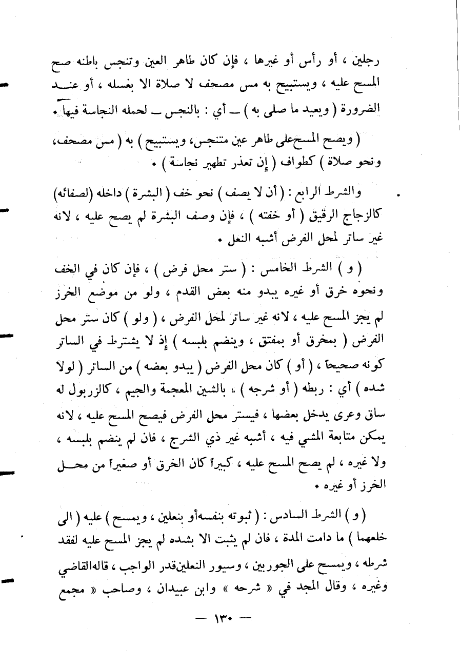 (وَ) الشَّرْطُ الْخَامِسُ: (سَتْرُ مَحَلِّ فَرْضٍ) ، فَإِنْ كَانَ فِي الْخُفِّ وَنَحْوِهِ خَرْقٌ أَوْ غَيْرُهُ يَبْدُو مِنْهُ بَعْضُ الْقَدَمِ، وَلَوْ مِنْ مَوْضِعِ الْخَرَزِ لَمْ يَجُزْ الْمَسْحُ عَلَيْهِ، لِأَنَّهُ غَيْرُ سَاتِرٍ لِمَحَلِّ الْفَرْضِ، (وَلَوْ) كَانَ سَتْرُ مَحَلِّ الْفَرْضِ (بِمُخَرَّقٍ أَوْ بِمُفَتَّقٍ، وَيَنْضَمُّ بِلُبْسِهِ) إذْ لَا يُشْتَرَطُ فِي السَّاتِرِ كَوْنُهُ صَحِيحًا، (أَوْ) كَانَ مَحَلُّ الْفَرْضِ (يَبْدُو بَعْضُهُ) مِنْ السَّاتِرِ (لَوْلَا شَدُّهُ) أَيْ: رَبْطُهُ (أَوْ شَرْجُهُ) ، بِالشِّينِ الْمُعْجَمَةِ وَالْجِيمِ، كَالزُّرْبُولِ لَهُ سَاقٌ وَعُرًى يَدْخُلُ بَعْضُهَا فَيَسْتُرُ مَحَلَّ الْفَرْضِ فَيَصِحُّ الْمَسْحُ عَلَيْهِ، لِأَنَّهُ يُمْكِنُ مُتَابَعَةُ الْمَشْيِ فِيهِ، أَشْبَهَ غَيْرَ ذِي الشَّرَجِ، فَإِنْ لَمْ يَنْضَمَّ بِلُبْسِهِ وَلَا غَيْرِهِ، لَمْ يَصِحَّ الْمَسْحُ عَلَيْهِ، كَبِيرًا كَانَ الْخَرْقُ أَوْ صَغِيرًا مِنْ مَحَلِّ الْخَرَزِ أَوْ غَيْرِهِ.