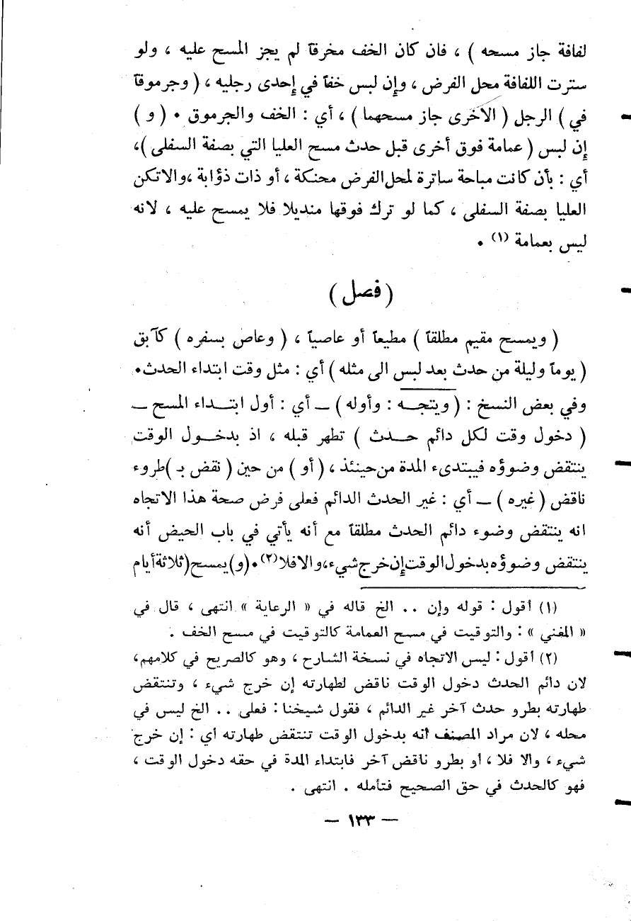 فَصْلٌ (وَيَمْسَحُ مُقِيمٌ مُطْلَقًا) مُطِيعًا أَوْ عَاصِيًا، (وَعَاصٍ بِسَفَرِهِ) كَآبِقٍ (يَوْمًا وَلَيْلَةً مِنْ حَدَثٍ بَعْدَ لُبْسٍ إلَى مِثْلِهِ) أَيْ: مِثْلِ وَقْتِ ابْتِدَاءِ الْحَدَثِ. وَفِي بَعْضِ النُّسَخِ: (وَيَتَّجِهُ: وَأَوَّلُهُ) - أَيْ: أَوَّلُ ابْتِدَاءِ الْمَسْحِ - (دُخُولُ وَقْتٍ لِكُلٍّ دَائِمٍ حَدَثٍ) تَطَهَّرَ قَبْلَهُ، إذْ بِدُخُولِ الْوَقْتِ يُنْتَقَضُ وُضُوءُهُ فَيَبْتَدِئُ الْمُدَّةَ مِنْ حِينَئِذٍ، (أَوْ) مِنْ حِينِ (نُقِضَ بِ) طُرُوءِ نَاقِضٍ (غَيْرِهِ) - أَيْ: غَيْرِ الْحَدَثِ الدَّائِمِ فَعَلَى فَرْضِ صِحَّةِ هَذَا الِاتِّجَاهِ أَنَّهُ يُنْتَقَضُ وُضُوءُ دَائِمِ الْحَدَثِ مُطْلَقًا مَعَ أَنَّهُ يَأْتِي فِي بَابِ الْحَيْضِ أَنَّهُ يُنْتَقَضُ وُضُوءُهُ بِدُخُولِ الْوَقْتِ إنْ خَرَجَ شَيْءٌ، وَإِلَّا فَلَا.
