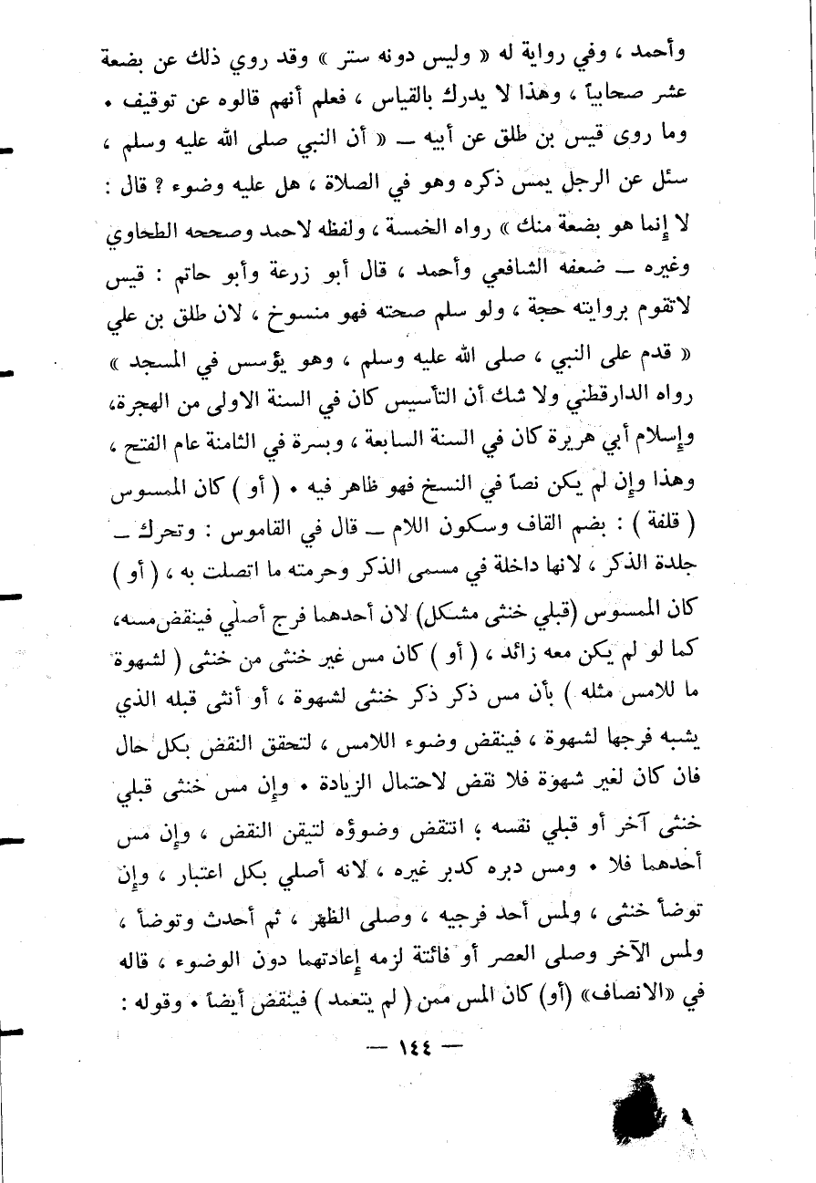 قَالَ أَبُو زُرْعَةَ وَأَبُو حَاتِمٍ: قَيْسٌ لَا تَقُومُ بِرِوَايَتِهِ حُجَّةٌ، وَلَوْ سُلِّمَ صِحَّتُهُ فَهُوَ مَنْسُوخٌ، لِأَنَّ طَلْقَ بْنَ عَلِيٍّ " قَدِمَ عَلَى النَّبِيِّ - صَلَّى اللَّهُ عَلَيْهِ وَسَلَّمَ - وَهُوَ يُؤَسِّسُ فِي الْمَسْجِدِ " رَوَاهُ الدَّارَقُطْنِيّ وَلَا شَكَّ أَنَّ التَّأْسِيسَ كَانَ فِي السَّنَةِ الْأُولَى مِنْ الْهِجْرَةِ، وَإِسْلَامَ أَبِي هُرَيْرَةَ فِي السَّنَةِ السَّابِعَةِ، وَبُسْرَةَ فِي الثَّامِنَةِ عَامَ الْفَتْحِ، وَهَذَا وَإِنْ لَمْ يَكُنْ نَصًّا فِي النَّسْخِ فَهُوَ ظَاهِرٌ فِيهِ. (أَوْ) كَانَ الْمَمْسُوسُ (قُلْفَةً) : بِضَمِّ الْقَافِ وَسُكُونِ اللَّامِ - قَالَ فِي الْقَامُوسِ: وَتَحَرُّكُ - جِلْدَةِ الذَّكَرِ، لِأَنَّهَا دَاخِلَةٌ فِي مُسَمَّى الذَّكَرِ وَحُرْمَتِهِ مَا اتَّصَلَتْ بِهِ، (أَوْ) كَانَ الْمَمْسُوسُ (قُبُلَيْ خُنْثَى مُشْكِلٍ) لِأَنَّ أَحَدَهُمَا فَرْجٌ أَصْلِيٌّ فَيَنْقُضُ مَسُّهُ، كَمَا لَوْ لَمْ يَكُنْ مَعَهُ زَائِدٌ، (أَوْ) كَانَ مَسُّ غَيْرِ خُنْثَى مِنْ خُنْثَى (لِشَهْوَةٍ مَا لِلَّامِسِ مَثَلُهُ) بِأَنْ مَسَّ ذَكَرٌ ذَكَرَ خُنْثَى لِشَهْوَةٍ، أَوْ أُنْثَى قُبُلَهُ الَّذِي يُشْبِهُ فَرْجَهَا لِشَهْوَةٍ، فَيُنْقَضُ وُضُوءُ اللَّامِسِ، لِتَحَقُّقِ النَّقْضِ بِكُلِّ حَالٍ فَإِنْ كَانَ لِغَيْرِ شَهْوَةٍ فَلَا نَقْضَ لِاحْتِمَالِ الزِّيَادَةِ. وَإِنْ مَسَّ خُنْثَى قُبُلَيْ خُنْثَى آخَرَ أَوْ قُبُلَيْ نَفْسِهِ؛ انْتَقَضَ وُضُوءُهُ لِتَيَقُّنِ النَّقْضِ، وَإِنْ مَسَّ أَحَدَهُمَا فَلَا. وَمَسُّ دُبُرِهِ كَدُبُرِ غَيْرِهِ، لِأَنَّهُ أَصْلِيٌّ بِكُلِّ اعْتِبَارٍ، وَإِنْ تَوَضَّأَ خُنْثَى، وَلَمَسَ أَحَدَ فَرْجَيْهِ، وَصَلَّى الظُّهْرَ، ثُمَّ أَحْدَثَ وَتَوَضَّأَ، وَلَمَسَ الْآخَرَ وَصَلَّى الْعَصْرَ أَوْ فَائِتَةً لَزِمَهُ إعَادَتُهُمَا دُونَ الْوُضُوءِ.