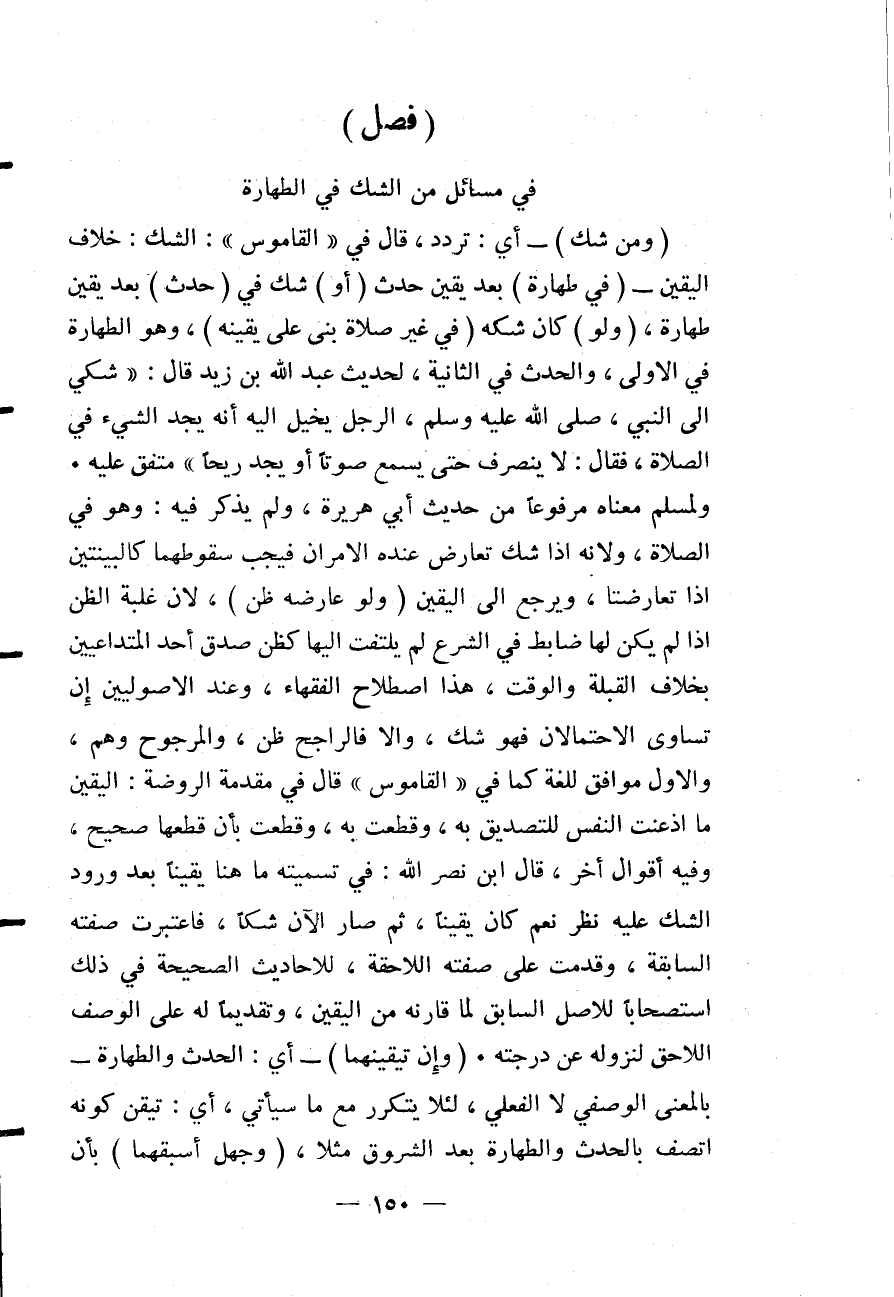 (فَصْلٌ) فِي مَسَائِلَ مِنْ الشَّكِّ فِي الطَّهَارَةِ (وَمَنْ شَكَّ) - أَيْ: تَرَدَّدَ، قَالَ فِي " الْقَامُوسِ ": الشَّكُّ: خِلَافُ الْيَقِينِ - (فِي طَهَارَةٍ) بَعْدَ يَقِينِ حَدَثٍ (أَوْ) شَكَّ فِي (حَدَثٍ) بَعْدَ يَقِينِ طَهَارَةٍ، (وَلَوْ) كَانَ شَكُّهُ (فِي غَيْرِ صَلَاةٍ) (بَنَى عَلَى يَقِينِهِ) ، وَهُوَ الطَّهَارَةُ فِي الْأُولَى، وَالْحَدَثُ فِي الثَّانِيَةِ، لِحَدِيثِ عَبْدِ اللَّهِ بْنِ زَيْدٍ قَالَ: «شُكِيَ إلَى النَّبِيِّ - صَلَّى اللَّهُ عَلَيْهِ وَسَلَّمَ - الرَّجُلُ يُخَيَّلُ إلَيْهِ أَنَّهُ يَجِدُ الشَّيْءَ فِي الصَّلَاةِ، فَقَالَ: لَا يَنْصَرِفْ حَتَّى يَسْمَعَ صَوْتًا أَوْ يَجِدَ رِيحًا» مُتَّفَقٌ عَلَيْهِ. وَلِمُسْلِمٍ مَعْنَاهُ مَرْفُوعًا مِنْ حَدِيثِ أَبِي هُرَيْرَةَ، وَلَمْ يَذْكُرْ فِيهِ: وَهُوَ فِي الصَّلَاةِ، وَلِأَنَّهُ إذَا شَكَّ تَعَارَضَ عِنْدَهُ الْأَمْرَانِ فَيَجِبُ سُقُوطُهُمَا كَالْبَيِّنَتَيْنِ إذَا تَعَارَضَتَا، وَيَرْجِعُ إلَى الْيَقِينِ (وَلَوْ عَارَضَهُ ظَنٌّ) ، لِأَنَّ غَلَبَةَ الظَّنِّ إذَا لَمْ يَكُنْ لَهَا ضَابِطٌ فِي الشَّرْعِ لَمْ يُلْتَفَتْ إلَيْهَا كَظَنِّ صِدْقِ أَحَدِ الْمُتَدَاعِيَيْنِ بِخِلَافِ الْقِبْلَةِ وَالْوَقْتِ، هَذَا اصْطِلَاحُ الْفُقَهَاءِ، وَعِنْدَ الْأُصُولِيِّينَ إنْ تَسَاوَى الِاحْتِمَالَانِ فَهُوَ شَكٌّ، وَإِلَّا فَالرَّاجِحُ ظَنٌّ، وَالْمَرْجُوحُ وَهْمٌ، وَالْأَوَّلُ مُوَافِقٌ لِلُّغَةِ كَمَا فِي " الْقَامُوسِ " قَالَ فِي مُقَدِّمَةِ الرَّوْضَةِ: الْيَقِينُ مَا أَذْعَنَتْ النَّفْسُ لِلتَّصْدِيقِ بِهِ، وَقَطَعَتْ بِهِ، وَقَطَعَتْ بِأَنَّ قَطْعَهَا صَحِيحٌ، وَفِيهِ أَقْوَالٌ أُخَرُ.
