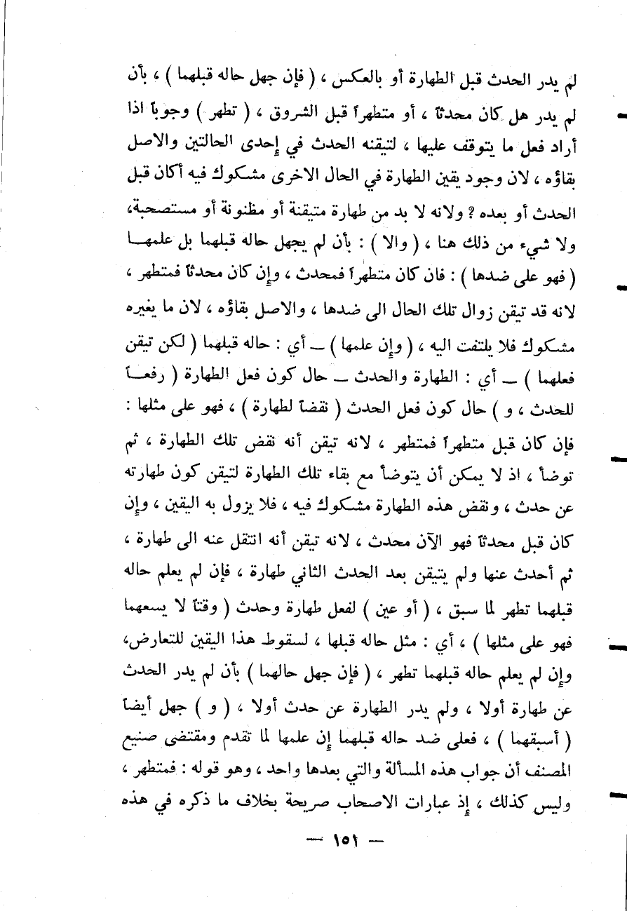 لَمْ يَدْرِ الْحَدَثَ قَبْلَ الطَّهَارَةِ أَوْ بِالْعَكْسِ، (فَإِنْ جَهِلَ قَبْلَهُمَا) ، بِأَنْ لَمْ يَدْرِ هَلْ كَانَ مُحْدِثًا، أَوْ مُتَطَهِّرًا قَبْلَ الشُّرُوقِ، (تَطَهَّرَ) وُجُوبًا إذَا أَرَادَ فِعْلَ مَا يَتَوَقَّفُ عَلَيْهَا، لِتَيَقُّنِهِ الْحَدَثَ فِي إحْدَى الْحَالَتَيْنِ وَالْأَصْلُ بَقَاؤُهُ، لِأَنَّ وُجُودَ يَقِينِ الطَّهَارَةِ فِي الْحَالِ الْأُخْرَى مَشْكُوكٌ فِيهِ أَكَانَ قَبْلَ الْحَدَثِ أَوْ بَعْدَهُ؟ وَلِأَنَّهُ لَا بُدَّ مِنْ طَهَارَةٍ مُتَيَقَّنَةٍ أَوْ مَظْنُونَةٍ أَوْ مُسْتَصْحَبَةٍ، وَلَا شَيْءَ مِنْ ذَلِكَ هُنَا، (وَإِلَّا) : بِأَنْ لَمْ يَجْهَلْ قَبْلَهُمَا بَلْ عَلِمَهَا (فَهُوَ عَلَى ضِدِّهَا) : فَإِنْ كَانَ مُتَطَهِّرًا فَمُحْدِثٌ، وَإِنْ كَانَ مُحْدِثًا فَمُتَطَهِّرٌ، لِأَنَّهُ قَدْ تَيَقَّنَ زَوَالَ تِلْكَ الْحَالِ إلَى ضِدِّهَا، وَالْأَصْلُ بَقَاؤُهُ، لِأَنَّ مَا يُغَيِّرُهُ مَشْكُوكٌ فَلَا يُلْتَفَتُ إلَيْهِ، (وَإِنْ عَلِمَهَا) - أَيْ: قَبْلَهُمَا (لَكِنْ تَيَقَّنَ فِعْلَهُمَا) - أَيْ: الطَّهَارَةَ وَالْحَدَثَ - حَالَ كَوْنِ فِعْلِ الطَّهَارَةِ (رَفْعًا لِلْحَدَثِ، وَ) حَالَ كَوْنِ فِعْلِ الْحَدَثِ (نَقْضًا لِطَهَارَةٍ) ، فَهُوَ عَلَى مِثْلِهَا: فَإِنْ كَانَ قَبْلُ مُتَطَهِّرًا فَمُتَطَهِّرٌ، لِأَنَّهُ تَيَقَّنَ أَنَّهُ نَقَضَ تِلْكَ الطَّهَارَةَ، ثُمَّ تَوَضَّأَ، إذْ لَا يُمْكِنُ أَنْ يَتَوَضَّأَ مَعَ بَقَاءِ تِلْكَ الطَّهَارَةِ لِتَيَقُّنِ كَوْنِ طَهَارَتِهِ عَنْ حَدَثٍ، وَنَقْضُ هَذِهِ الطَّهَارَةِ مَشْكُوكٌ فِيهِ فَلَا يَزُولُ بِهِ الْيَقِينُ، وَإِنْ كَانَ قَبْلُ مُحْدِثًا فَهُوَ الْآنَ مُحْدِثٌ لِأَنَّهُ تَيَقَّنَ أَنَّهُ انْتَقَلَ عَنْهُ إلَى طَهَارَةٍ، ثُمَّ أَحْدَثَ عَنْهَا وَلَمْ يَتَيَقَّنْ بَعْدَ الْحَدَثِ الثَّانِي طَهَارَةً، فَإِنْ لَمْ يَعْلَمْ قَبْلَهُمَا تَطَهَّرَ لِمَا سَبَقَ، (أَوْ عَيَّنَ) لِفِعْلِ طَهَارَةٍ وَحَدَثٍ (وَقْتًا لَا يَسَعُهُمَا فَهُوَ عَلَى مِثْلِهَا) ، أَيْ: مِثْلِ حَالِهِ قَبْلَهَا، لِسُقُوطِ هَذَا الْيَقِينِ لِلتَّعَارُضِ، وَإِنْ لَمْ يَعْلَمْ قَبْلَهُمَا تَطَهَّرَ، (فَإِنْ جَهِلَ حَالَهُمَا) بِأَنْ لَمْ يَدْرِ الْحَدَثَ عَنْ طَهَارَةٍ أَوْ لَا، وَلَمْ يَدْرِ الطَّهَارَةَ عَنْ حَدَثٍ أَوْ لَا (وَ) جَهِلَ أَيْضًا (أَسْبَقَهُمَا) ، فَعَلَى ضِدِّ حَالِهِ قَبْلَهُمَا إنْ عَلِمَهَا لِمَا تَقَدَّمَ، وَمُقْتَضَى صَنِيعِ الْمُصَنِّفِ أَنَّ جَوَابَ هَذِهِ الْمَسْأَلَةِ وَاَلَّتِي بَعْدَهَا وَاحِدٌ، وَهُوَ قَوْلُهُ: فَمُتَطَهِّرٌ، وَلَيْسَ كَذَلِكَ، إذْ عِبَارَاتُ الْأَصْحَابِ صَرِيحَةٌ بِخِلَافِ مَا ذَكَرَهُ فِي هَذِهِ