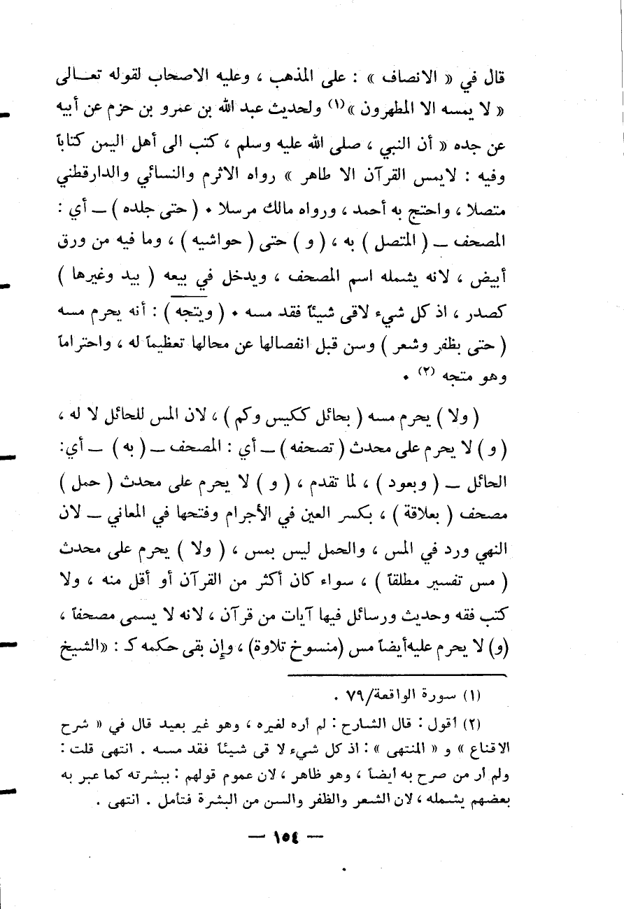 قَالَ فِي " الْإِنْصَافِ ": عَلَى الْمَذْهَبِ وَعَلَيْهِ الْأَصْحَابُ لِقَوْلِهِ تَعَالَى {لا يَمَسُّهُ إِلا الْمُطَهَّرُونَ} [الواقعة: 79] وَلِحَدِيثِ عَبْدِ اللَّهِ بْنِ عَمْرِو بْنِ حَزْمٍ عَنْ أَبِيهِ عَنْ جَدِّهِ «أَنَّ النَّبِيَّ - صَلَّى اللَّهُ عَلَيْهِ وَسَلَّمَ - كَتَبَ إلَى أَهْلِ الْيَمَنِ كِتَابًا وَفِيهِ: لَا يَمَسُّ الْقُرْآنَ إلَّا طَاهِرٌ» رَوَاهُ الْأَثْرَمُ وَالنَّسَائِيُّ وَالدَّارَقُطْنِيّ مُتَّصِلًا، وَاحْتَجَّ بِهِ أَحْمَدُ، وَرَوَاهُ مَالِكٌ مُرْسَلًا. (حَتَّى جِلْدَهُ) - أَيْ: الْمُصْحَفِ - (الْمُتَّصِلَ) بِهِ، (وَ) حَتَّى (حَوَاشِيَهُ) ، وَمَا فِيهِ مِنْ وَرِقٍ أَبْيَضَ، لِأَنَّهُ يَشْمَلُهُ اسْمُ الْمُصْحَفِ، وَيَدْخُلُ فِي بَيْعِهِ (بِيَدٍ وَغَيْرِهَا) كَصَدْرٍ، إذْ كُلُّ شَيْءٍ لَاقَى شَيْئًا فَقَدْ مَسَّهُ. (وَيَتَّجِهُ) : أَنَّهُ يَحْرُمُ مَسُّهُ (حَتَّى بِظُفْرٍ وَشَعْرٍ) وَسِنٍّ قَبْلَ انْفِصَالِهَا عَنْ مَحَالِّهَا تَعْظِيمًا لَهُ، وَاحْتِرَامًا وَهُوَ مُتَّجِهٌ.