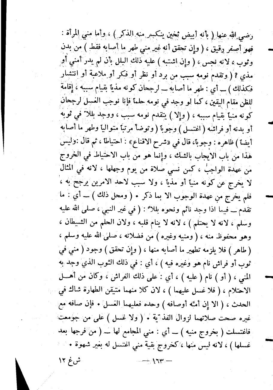 - رَضِيَ اللَّهُ عَنْهَا - (بِأَنَّهُ أَبْيَضُ ثَخِينٌ يَنْكَسِرُ مِنْهُ الذَّكَرُ) ، وَأَمَّا مَنِيُّ الْمَرْأَةِ: فَهُوَ أَصْفَرُ رَقِيقٌ، (وَإِنْ تَحَقَّقَ أَنَّهُ غَيْرُ مَنِيٍّ طُهِّرَ مَا أَصَابَهُ فَقَطْ) مِنْ بَدَنٍ وَثَوْبٍ، لِأَنَّهُ نَجَسٌ، (وَإِنْ اشْتَبَهَ) عَلَيْهِ ذَلِكَ الْبَلَلُ بِأَنْ لَمْ يَدْرِ أَمَنِيٌّ أَوْ مَذْيٌ؟ (وَتَقَدَّمَ نَوْمَهُ سَبَبٌ مِنْ بَرْدٍ أَوْ نَظَرٍ أَوْ فِكْرٍ أَوْ مُلَاعَبَةٍ أَوْ انْتِشَارٍ فَكَذَلِكَ) - أَيْ: طَهَّرَ مَا أَصَابَهُ - لِرُجْحَانِ كَوْنِهِ مَذْيًا بِقِيَامِ سَبَبِهِ، إقَامَةً لِلظَّنِّ مَقَامَ الْيَقِينِ، كَمَا لَوْ وُجِدَ فِي نَوْمِهِ حُلْمًا فَإِنَّا نُوجِبُ الْغُسْلَ لِرُجْحَانِ كَوْنِهِ مَنِيًّا بِقِيَامِ سَبَبِهِ، (وَإِلَّا يَتَقَدَّمْ نَوْمَهُ سَبَبٌ) ، وَوَجَدَ بَلَلًا فِي ثَوْبِهِ أَوْ بَدَنِهِ أَوْ فِرَاشِهِ (اغْتَسَلَ) وُجُوبًا (وَتَوَضَّأَ مُرَتِّبًا مُتَوَالِيًا وَطَهَّرَ مَا أَصَابَهُ أَيْضًا) ظَاهِرُهُ: وُجُوبًا.