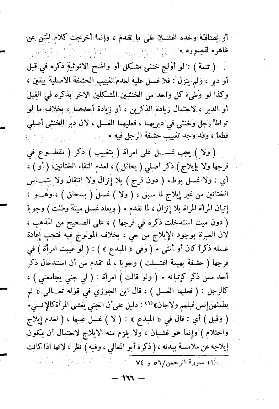 قَالَ ابْنُ الْجَوْزِيِّ فِي قَوْله تَعَالَى {لَمْ يَطْمِثْهُنَّ إِنْسٌ قَبْلَهُمْ وَلا جَانٌّ} [الرحمن: 56] : دَلِيلٌ عَلَى أَنَّ الْجِنِّيَّ يَغْشَى الْمَرْأَةَ كَالْإِنْسِيِّ. (وَقِيلَ) أَيْ: قَالَ فِي " الْمُبْدِعِ ": (لَا) غُسْلَ عَلَيْهَا، (لِعَدَمِ إيلَاجٍ وَاحْتِلَامٍ) وَإِنَّمَا هُوَ غَشَيَانٌ، وَلَا يَلْزَمُ مِنْهُ الْإِيلَاجُ لِاحْتِمَالِ أَنْ يَكُونَ إيلَاجُهُ عَنْ مُلَامَسَةٍ بِبَدَنِهِ، (ذَكَرَهُ أَبُو الْمَعَالِي وَفِيهِ) نَظَرٌ، لِأَنَّهَا إذَا كَانَتْ