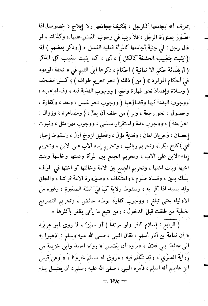 (وَذَكَرَ بَعْضُهُمْ) أَنَّهُ (يَثْبُتُ بِتَغْيِيبِ الْحَشَفَةِ كَالْكُلِّ) ، أَيْ: كَمَا يَثْبُتُ بِتَغْيِيبِ كُلِّ الذَّكَرِ (أَرْبَعُمِائَةِ حُكْمٍ إلَّا ثَمَانِيَةَ) أَحْكَامٍ، ذَكَرَهَا ابْنُ الْقَيِّمِ فِي " تُحْفَةِ الْوَدُودِ فِي أَحْكَامِ الْمَوْلُودِ " (مِنْ) ذَلِكَ (نَحْوُ تَحْرِيمِ طَوَافٍ) كَمَسِّ مُصْحَفٍ (وَصَلَاةٍ، وَإِفْسَادُ نَحْوِ طَهَارَةٍ وَحَجٍّ) وَوُجُوبُ الْفِدْيَةِ فِيهِ، وَفَسَادُ عُمْرَةٍ، وَوُجُوبُ الْبَدَنَةِ فِيهَا وَقَضَاؤُهُمَا (وَوُجُوبُ نَحْوِ غُسْلٍ وَحَدٍّ وَكَفَّارَةٍ، وَحُصُولُ نَحْوِ رَجْعَةٍ، وَبِرٍّ) مِنْ حَلِفٍ أَنْ يَطَأَ (وَمُصَاهَرَةٌ، وَزَوَالُ: نَحْوِ عُنَّةٍ) ، وَوُجُوبُ عِدَّةٍ، وَاسْتِقْرَارُ مُسَمًّى، وَوُجُوبُ مَهْرِ مِثْلٍ، وَثُبُوتُ إحْصَانٍ، وَجَرَيَانُ لِعَانٍ، وَفِدْيَةُ مُولٍ، وَتَحْلِيلٌ لِزَوْجٍ أَوَّلٍ، وَسُقُوطُ إجْبَارٍ فِي نِكَاحِ بِكْرٍ، وَتَحْرِيمُ رَبَائِبَ، وَتَحْرِيمُ إمَاءِ الْأَبِ عَلَى الِابْنِ، وَتَحْرِيمُ إمَاءِ الِابْنِ عَلَى الْأَبِ، وَتَحْرِيمُ الْجَمْعِ بَيْنَ الْمَرْأَةِ وَعَمَّتِهَا وَخَالَتِهَا وَبِنْتِ أَخِيهَا وَبِنْتِ أُخْتِهَا، وَتَحْرِيمُ الْجَمْعِ بَيْنَ الْأَمَةِ وَخَالَتِهَا أَوْ أُخْتِهَا فِي الْوَطْءِ بِمِلْكِ يَمِينٍ، وَفَسَادُ صَوْمٍ وَاعْتِكَافٍ، وَصَيْرُورَةُ الْأَمَةِ فِرَاشًا، وَإِلْحَاقُ وَلَدٍ بِسَيِّدٍ إذَا أَقَرَّ بِهِ، وَسُقُوطُ وِلَايَةِ أَبٍ فِي ابْنَتِهِ الصَّغِيرَةِ وَغَيْرِهِ مِنْ الْأَوْلِيَاءِ حَتَّى تَبْلُغَ، وَوُجُوبُ كَفَّارَةٍ بِوَطْءِ حَائِضٍ، وَتَحْرِيمُ التَّصْرِيحِ بِخِطْبَةِ مَنْ طَلُقَتْ قَبْلَ الدُّخُولِ، وَمَنْ تَتَبَّعَ مَا يَأْتِي يَظْفَرُ بِأَكْثَرِهَا.