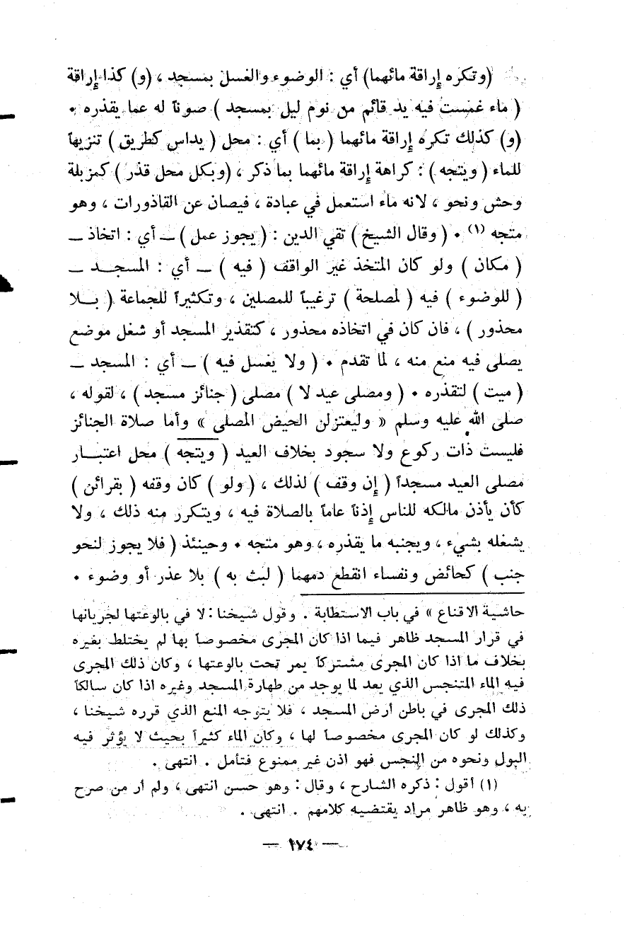 (وَقَالَ الشَّيْخُ) تَقِيُّ الدِّينِ: (يَجُوزُ عَمَلٌ) - أَيْ: اتِّخَاذُ - (مَكَانٍ) وَلَوْ كَانَ الْمُتَّخِذُ غَيْرَ الْوَاقِفِ (فِيهِ) - أَيْ: الْمَسْجِدِ - (لِلْوُضُوءِ) فِيهِ (لِمَصْلَحَةٍ) تَرْغِيبًا لِلْمُصَلِّينَ، وَتَكْثِيرًا لِلْجَمَاعَةِ (بِلَا مَحْذُورٍ) ، فَإِنْ كَانَ فِي اتِّخَاذِهِ مَحْذُورٌ، كَتَقْذِيرِ الْمَسْجِدِ أَوْ شَغْلِ مَوْضِعٍ يُصَلَّى فِيهِ مُنِعَ مِنْهُ، لِمَا تَقَدَّمَ. (وَلَا يُغَسَّلُ فِيهِ) - أَيْ: الْمَسْجِدِ - (مَيِّتٌ) لَتَقَذُّرِهِ.