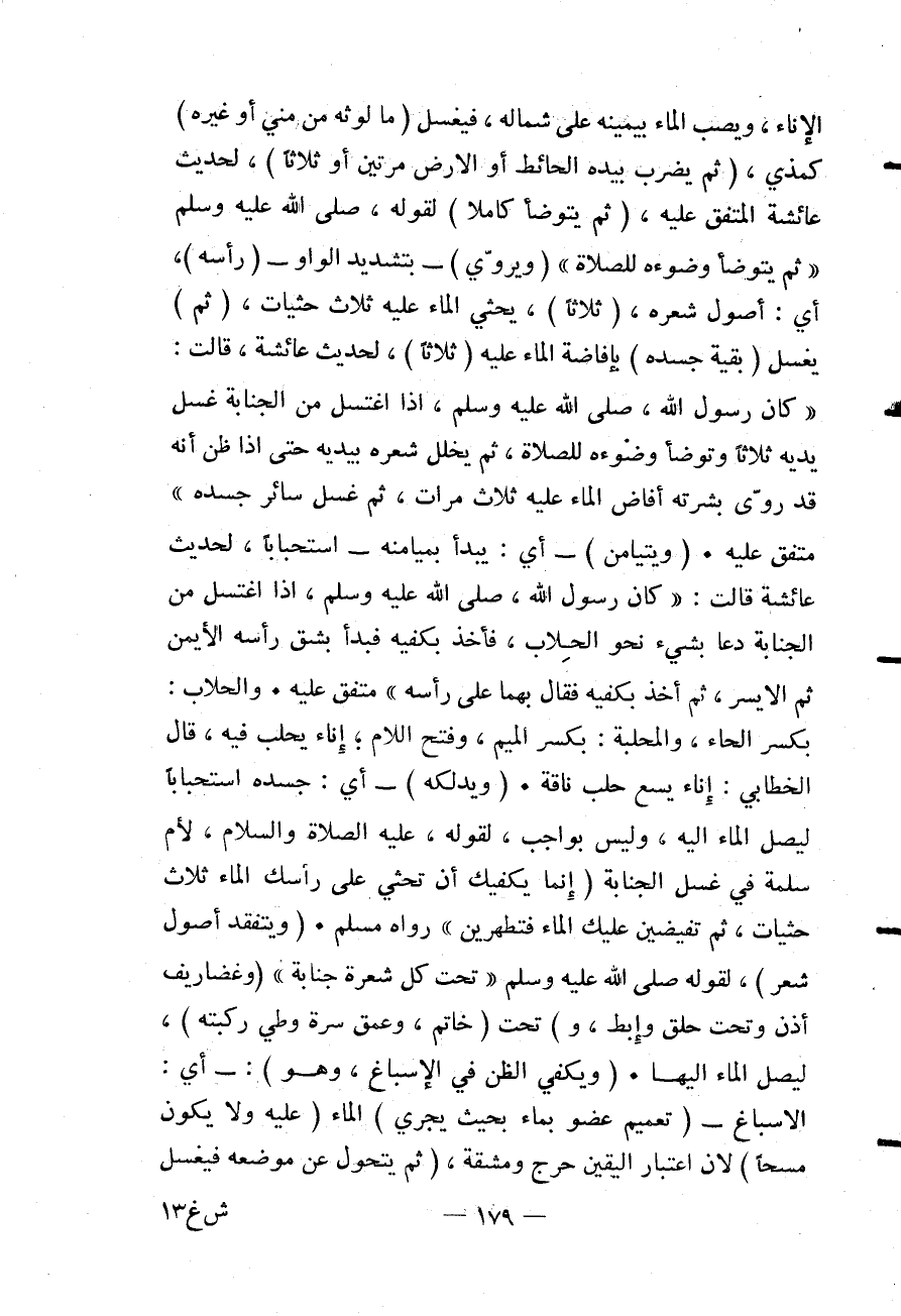 الْإِنَاءَ، وَيَصُبَّ الْمَاءَ بِيَمِينِهِ عَلَى شِمَالِهِ، فَيَغْسِلَ (مَا لَوَّثَهُ مِنْ مَنِيٍّ أَوْ غَيْرِهِ) كَمَذْيٍ، (ثُمَّ يَضْرِبَ بِيَدِهِ الْحَائِطَ أَوْ الْأَرْضَ مَرَّتَيْنِ أَوْ ثَلَاثًا) ، لِحَدِيثِ عَائِشَةَ الْمُتَّفِقِ عَلَيْهِ، (ثُمَّ يَتَوَضَّأَ كَامِلًا) لِقَوْلِهِ - صَلَّى اللَّهُ عَلَيْهِ وَسَلَّمَ - «ثُمَّ يَتَوَضَّأَ وُضُوءَهُ لِلصَّلَاةِ» (وَيُرَوِّيَ) - بِتَشْدِيدِ الْوَاوِ - (رَأْسَهُ) ، أَيْ: أُصُولَ شَعْرِهِ، (ثَلَاثًا) ، يَحْثِيَ الْمَاءَ عَلَيْهِ ثَلَاثَ حَثَيَاتٍ، (ثُمَّ) يَغْسِلَ (بَقِيَّةَ جَسَدِهِ) بِإِفَاضَةِ الْمَاءِ عَلَيْهِ (ثَلَاثًا) ، لِحَدِيثِ عَائِشَةَ، قَالَتْ: «كَانَ رَسُولُ اللَّهِ - صَلَّى اللَّهُ عَلَيْهِ وَسَلَّمَ - إذَا اغْتَسَلَ مِنْ الْجَنَابَةِ غَسَلَ يَدَيْهِ ثَلَاثًا وَتَوَضَّأَ وُضُوءَهُ لِلصَّلَاةِ، ثُمَّ يُخَلِّلَ شَعْرَهُ بِيَدَيْهِ حَتَّى إذَا ظَنَّ أَنَّهُ قَدْ رَوَى بَشَرَتَهُ أَفَاضَ الْمَاءَ عَلَيْهِ ثَلَاثَ مَرَّاتٍ، ثُمَّ غَسَلَ سَائِرَ جَسَدِهِ» مُتَّفَقٌ عَلَيْهِ (وَيَتَيَامَنَ) - أَيْ: يَبْدَأَ بِمَيَامِنِهِ - اسْتِحْبَابًا، لِحَدِيثِ عَائِشَةَ قَالَتْ: «كَانَ رَسُولُ اللَّهِ - صَلَّى اللَّهُ عَلَيْهِ وَسَلَّمَ - إذَا اغْتَسَلَ مِنْ الْجَنَابَةِ دَعَا بِشَيْءٍ نَحْوَ الْحِلَابِ، فَأَخَذَ بِكَفَّيْهِ فَبَدَأَ بِشِقِّ رَأْسِهِ الْأَيْمَنِ ثُمَّ الْأَيْسَرِ، ثُمَّ أَخَذَ بِكَفَّيْهِ فَقَالَ بِهِمَا عَلَى رَأْسِهِ» مُتَّفَقٌ عَلَيْهِ وَالْحِلَابُ: بِكَسْرِ الْحَاءِ، وَالْمِحْلَبَةُ: بِكَسْرِ الْمِيمِ، وَفَتْحِ اللَّامِ؛ إنَاءٌ يُحْلَبُ فِيهِ.