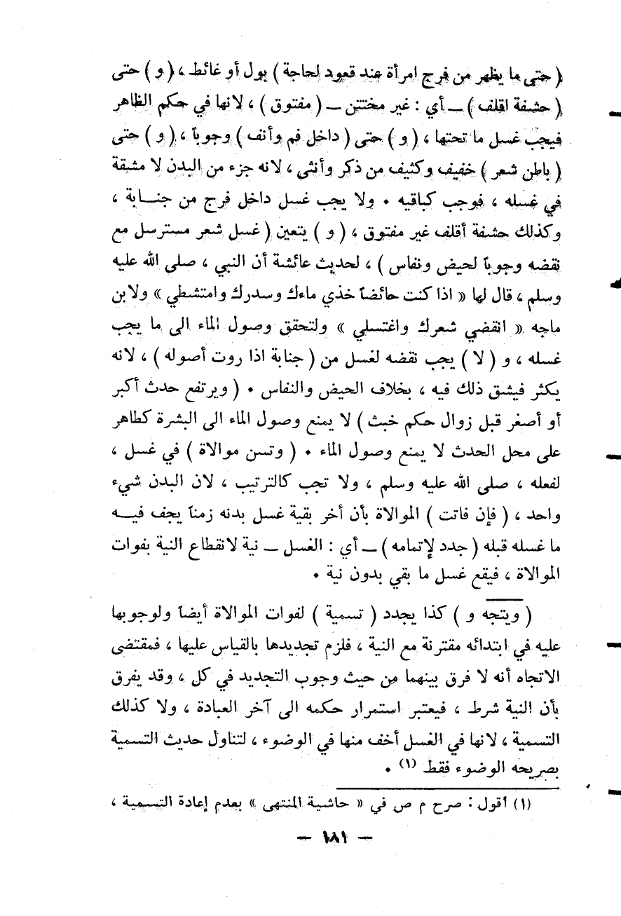(وَتُسَنُّ مُوَالَاةٌ) فِي غُسْلٍ، لِفِعْلِهِ - صَلَّى اللَّهُ عَلَيْهِ وَسَلَّمَ - وَلَا تَجِبُ كَالتَّرْتِيبِ؛ لِأَنَّ الْبَدَنَ شَيْءٌ وَاحِدٌ، (فَإِنْ فَاتَتْ) الْمُوَالَاةُ بِأَنْ أَخَّرَ بَقِيَّةَ غَسْلِ بَدَنِهِ زَمَنًا يَجِفُّ فِيهِ مَا غَسَلَهُ قَبْلَهُ (جَدَّدَ لِإِتْمَامِهِ) - أَيْ: الْغُسْلَ - نِيَّةً لِانْقِطَاعِ النِّيَّةِ بِفَوَاتِ الْمُوَالَاةِ، فَيَقَعُ غَسْلُ مَا بَقِيَ بِدُونِ نِيَّةٍ. (وَيَتَّجِهُ وَ) كَذَا يُجَدِّدُ (تَسْمِيَةً) لِفَوَاتِ الْمُوَالَاةِ أَيْضًا وَلِوُجُوبِهَا عَلَيْهِ فِي ابْتِدَائِهِ مُقْتَرِنَةً مَعَ النِّيَّةِ، فَلَزِمَ تَجْدِيدُهَا بِالْقِيَاسِ عَلَيْهَا، فَمُقْتَضَى الِاتِّجَاهِ أَنَّهُ لَا فَرْقَ بَيْنَهُمَا مِنْ حَيْثُ وُجُوبُ التَّجْدِيدِ فِي كُلٍّ، وَقَدْ يُفَرَّقُ بِأَنَّ النِّيَّةَ شَرْطٌ، فَيُعْتَبَرُ اسْتِمْرَارُ حُكْمِهِ إلَى آخِرِ الْعِبَادَةِ، وَلَا كَذَلِكَ التَّسْمِيَةُ؛ لِأَنَّهَا فِي الْغُسْلِ أَخَفُّ مِنْهَا فِي الْوُضُوءِ، لِتَنَاوُلِ حَدِيثِ التَّسْمِيَةِ بِصَرِيحِهِ الْوُضُوءَ فَقَطْ.